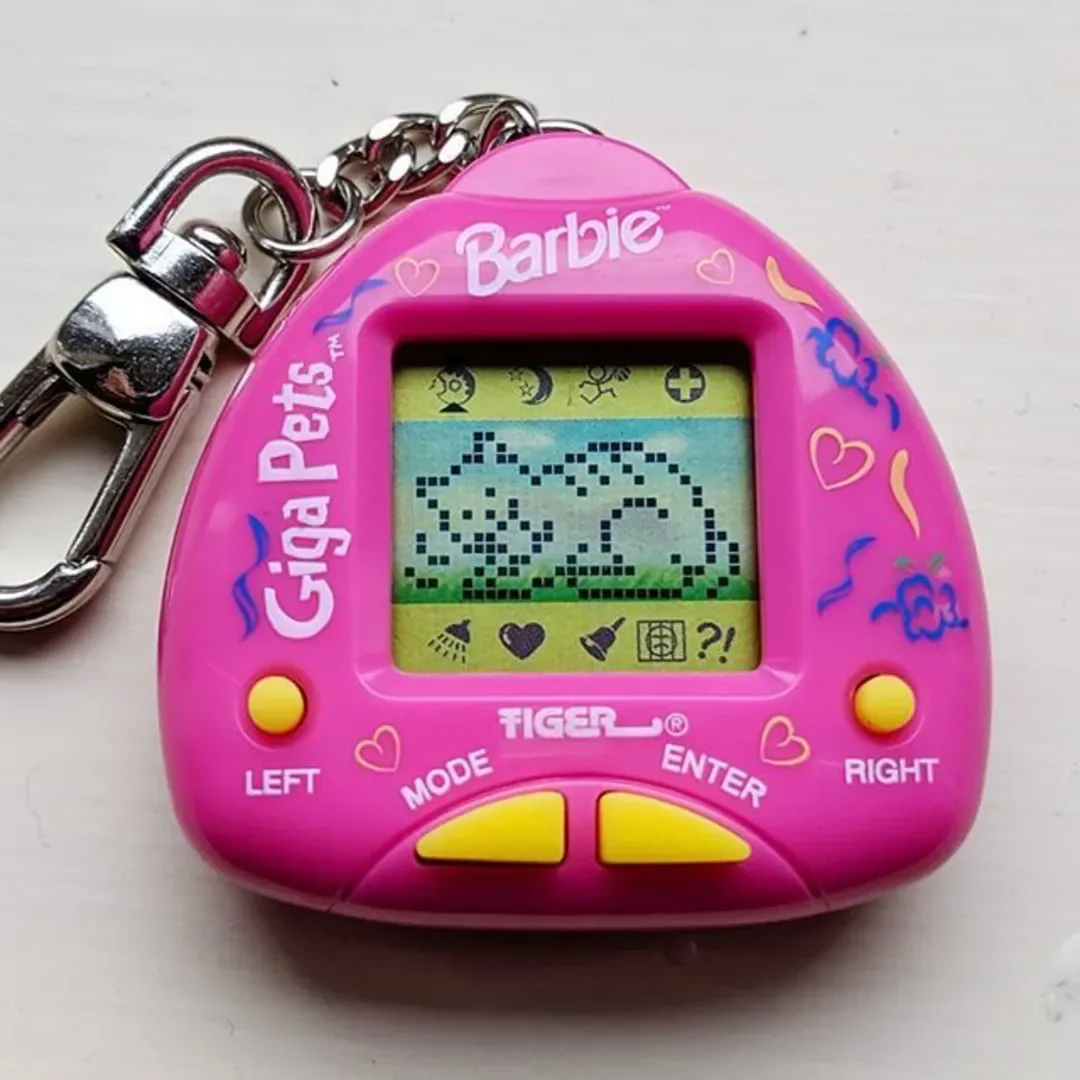 Giga Pets are digital pet toys. Available in a variety of different characters, each Giga Pet is a palm-sized unit with an LCD screen and attached key ring. To ensure a happy, healthy pet, its owner has to take care of it similar to how one might care for a real animal, including feeding, cleaning, and playing with their Giga Pet.