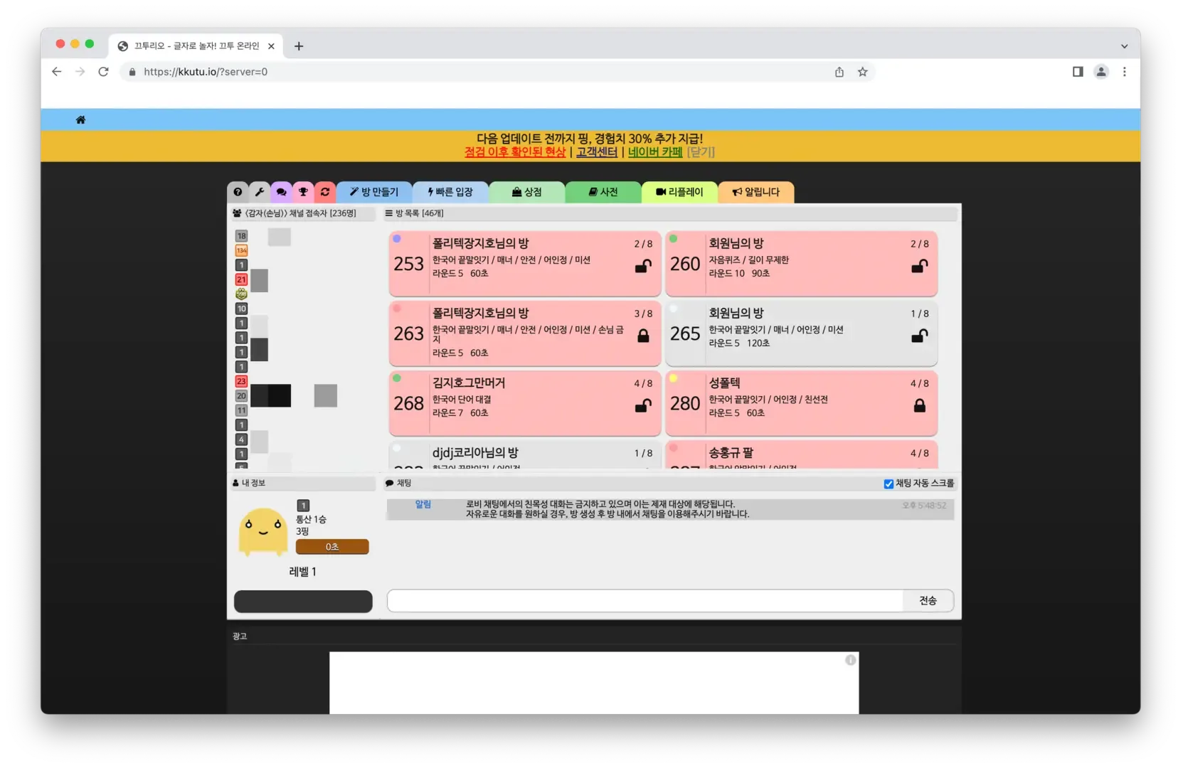 KKuTuIO is a web real-time online game using Korean and English words, and there are currently more than 15 game types. Depending on the game type, you can earn points by entering the appropriate words on your turn. The participant with the highest score in the game wins.