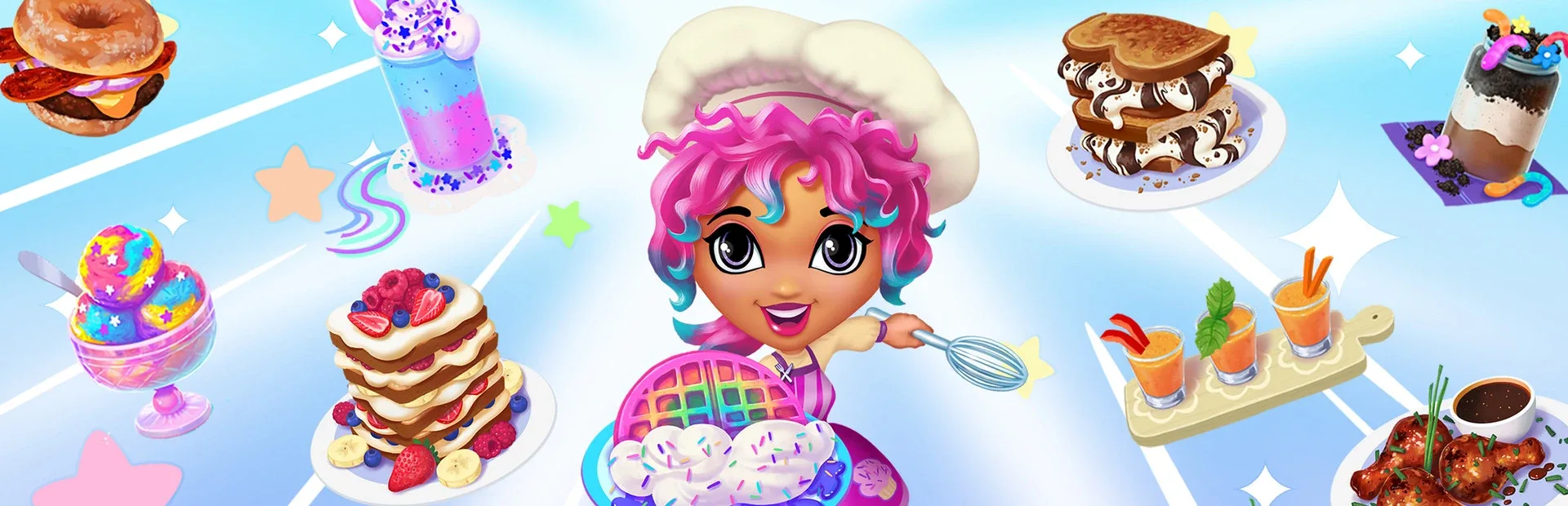 Stir, fry, chop and bake your way through over 70 unique recipes in Yum Yum Cookstar. Impress the judges with dishes like Rainbow Waffels, Unicorn Smoothies or Sushi Burritos in an energetic cooking competition hosted by Chef Yum Yum.