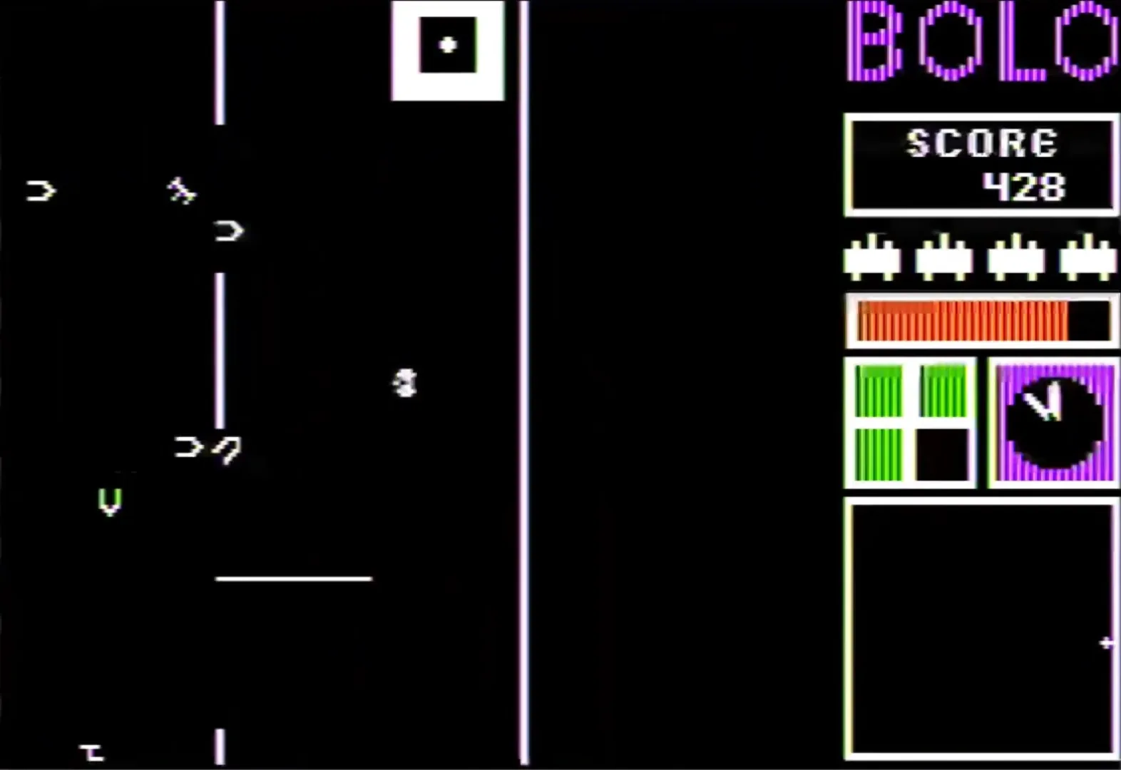 Upon startup Bolo requests a level number (1–9) and density (1–5); the game then generates a random rectangular maze containing six enemy bases. The higher the density specified, the more walls appear in the maze. The player controls a tank, and must destroy the six enemy bases to advance to the next level. The player can view 1/132 of the maze at one time; indicators on the right side of the screen show the player's position within the maze, the direction of the enemy bases and the fuel remaining. Enemy tanks constantly emerge from each of the six enemy bases. Different levels feature different types of enemy tanks; some move randomly while others pursue the player. All enemy tanks fire deadly shells. If the player collides with a bullet, an enemy base or tank, or a wall, a turn is lost. A turn is also lost if the player runs out of fuel; destroying an enemy base will replenish the player's fuel supply. The player is provided with four tanks per game, and no opportunity is provided to earn more.