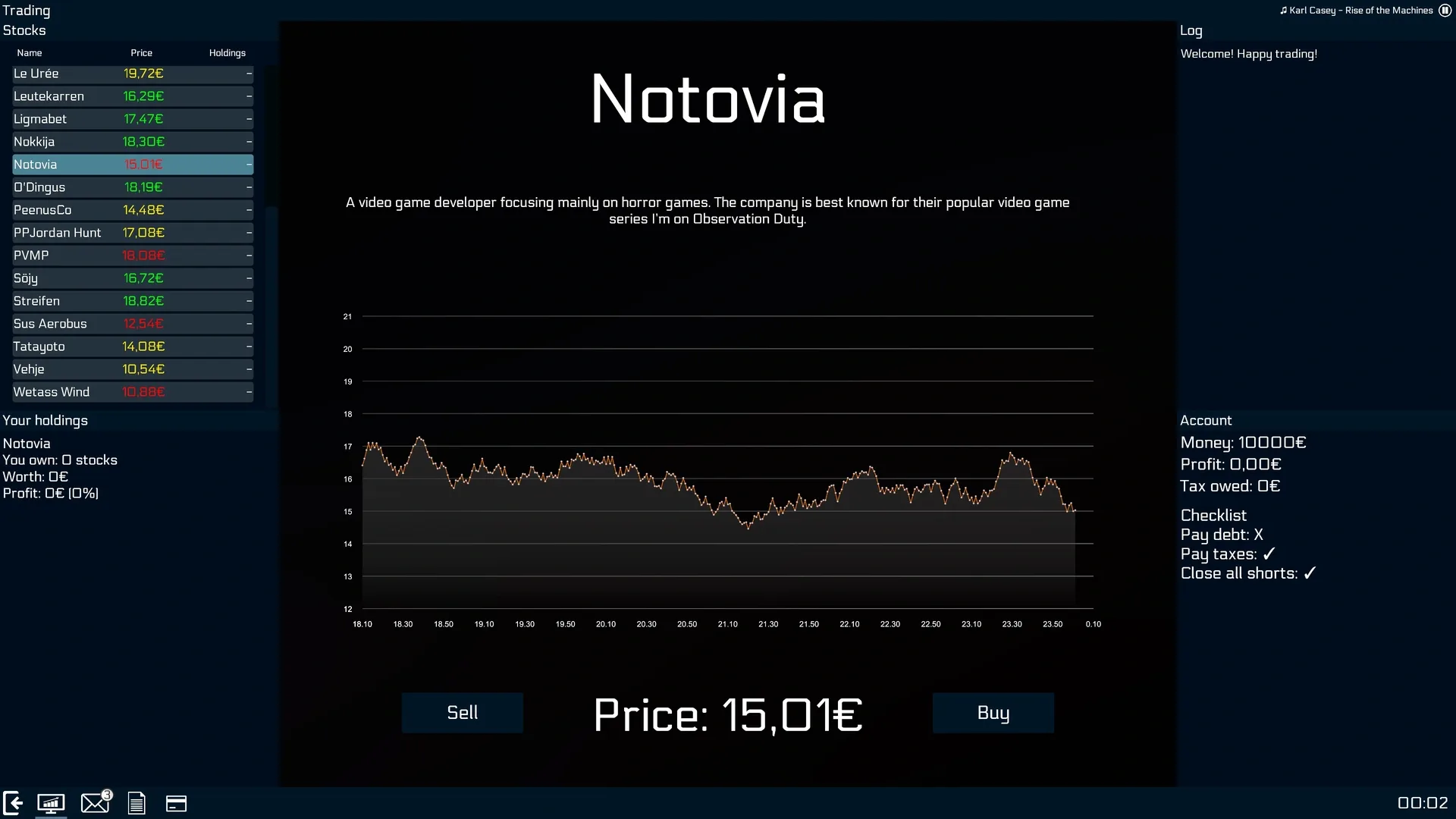 A horror-themed stock market simulator where the player must make enough money to pay their debt in time. Buy, sell and short shares in fictional companies, earn dividends, pay taxes and follow the in-game news for possible hints on what to invest in. No previous experience in stock market required.