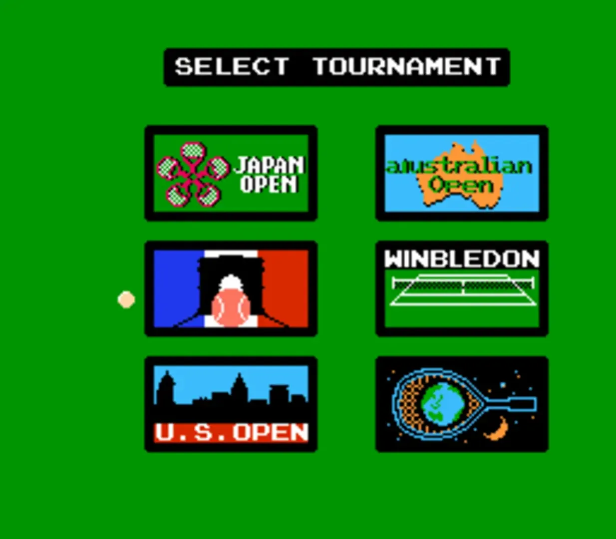 Family Tennis is Namco's first tennis game, it features a roster of sixteen players (twelve male and four female) all based on real-life professional tennis players at the time, such as Ivan Lendl, Boris Becker, Mats Wilander, Martina Navratilova and Steffi Graf. The game includes six tournaments, including the Australian Open, Wimbledon and the U.S. Open, and offers play on grass, clay, and hardcourts, as well as a unique "cosmo" surface that takes place in outer space with astronaut ballboys. There are three modes of play to choose from: exhibition, tournament and world tour. Exhibition mode consists of a single exhibition match for one or two players, while Tournament mode allows up to eight players to face off in a singles tourney. Both of these modes also include a "Watch" option, in which all players are controlled by the computer. World Tour mode takes the player through an entire year on tour playing against computer-controlled opponents, using a password save system. Doubles matches aren't available in any mode though.