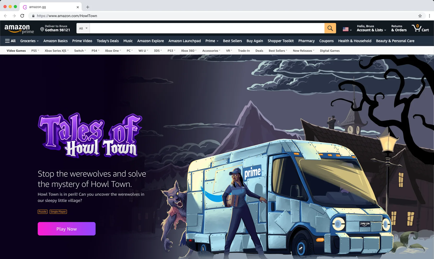 Stop the werewolves and solve the mystery of Howl Town. Tales of Howl Town is a single-player mystery-themed puzzle game playable on Amazon.com. As Amazon delivery driver Zara Briggs, you must identify and banish four werewolves disguised as town villagers. But be warned: banishing the wrong villagers may have disastrous consequences! Tales of Howl Town is available to US players from 10/27/2022 to 10/31/2022.
