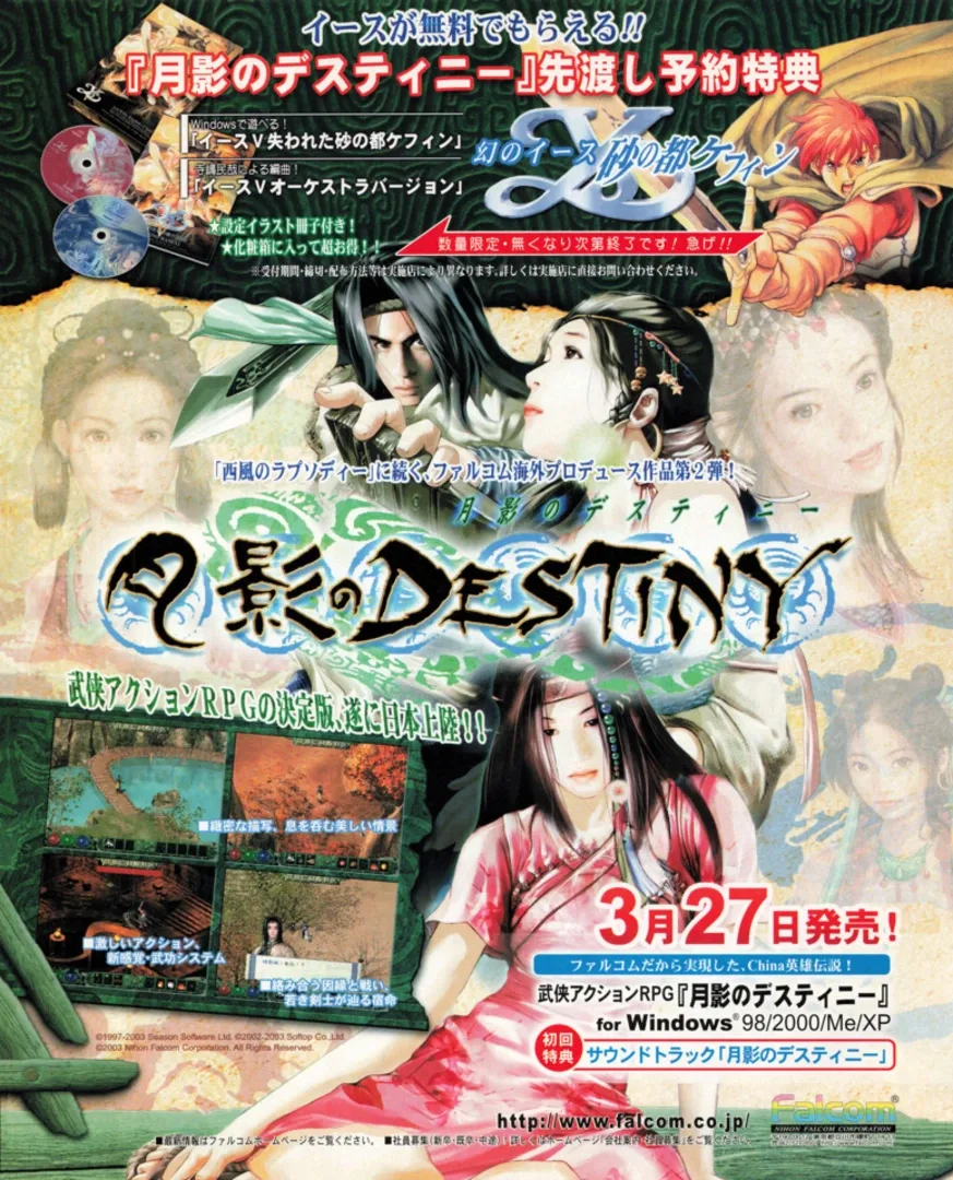 A Chinese developed role-playing game that was later localized into Japanese by Nihon Falcom under the name Moonlight Destiny. Yue Ying Chuan Shuo Jian Xia Qing Yuan Wai Zhuan is a role-playing game. Many years ago, two of the most famous people in Wulin were Yang Xilie and Shangguan Feilong. Yang Xilie, as his name implies, has a fierce personality, and often competes with Shangguan Feilong. But Shangguan Feilong is indifferent to fame and fortune and dislikes fighting with others, so he ignores his provocations, which makes Yang Xilie more and more angry. After a thrilling life-and-death struggle, Shangguan Feilong was defeated by Yang Xilie at last. But eventually the two men and up that. Ten years after those events Yang Yingfeng (Yang Xilie's son) is already a young man. He still remembers the scene ten years ago. Yang Yingfeng feels that he should go out for an adventure.