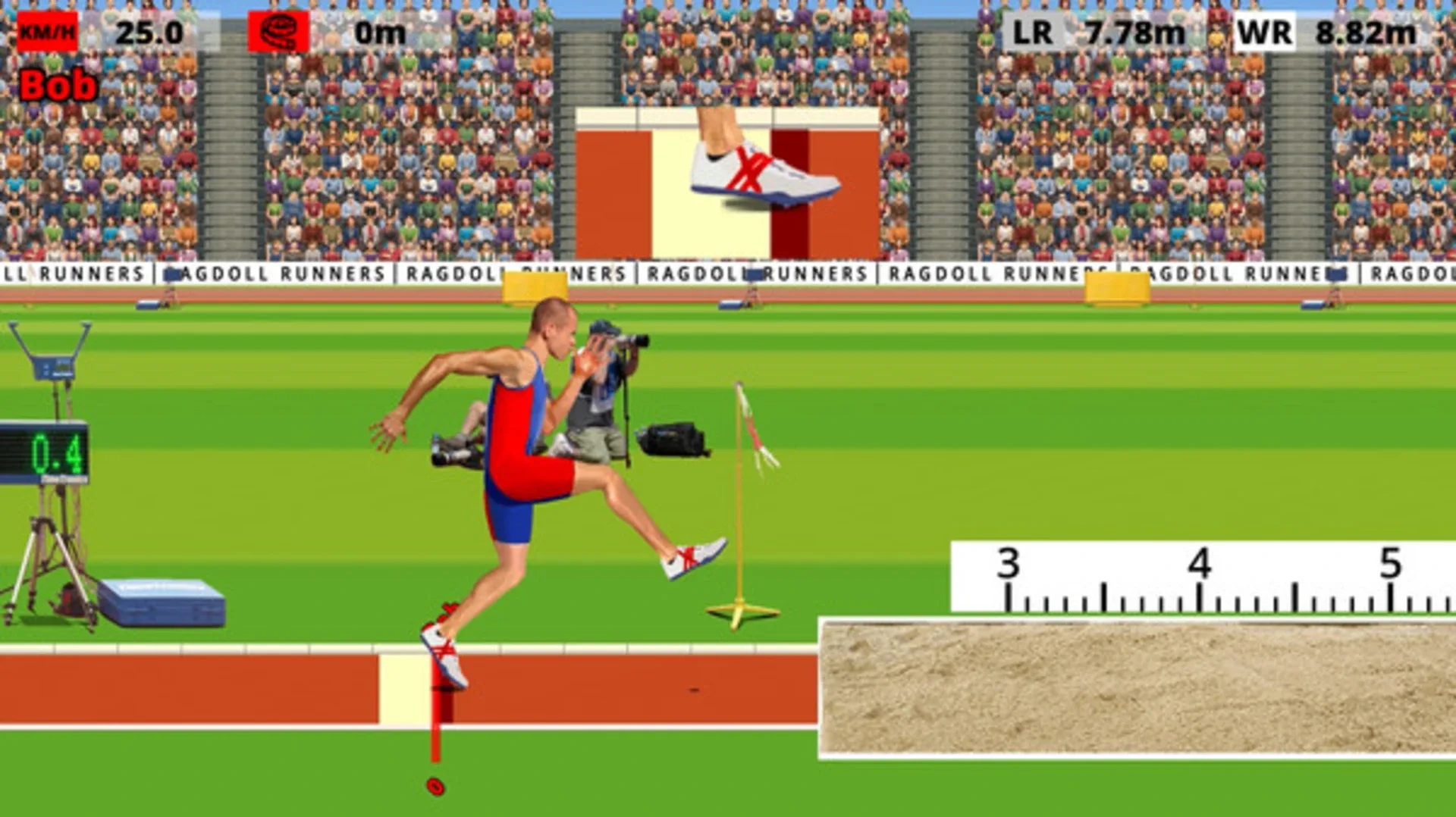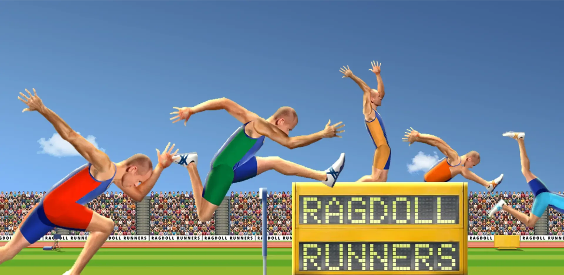 Ragdoll Runners is a physics-based athletics game where you control independently the two legs of an athlete in 8 events of different types: sprint, long jump, triple jump, hurdles. Play against the computer, with 3 friends on the same PC or online against other players' records.