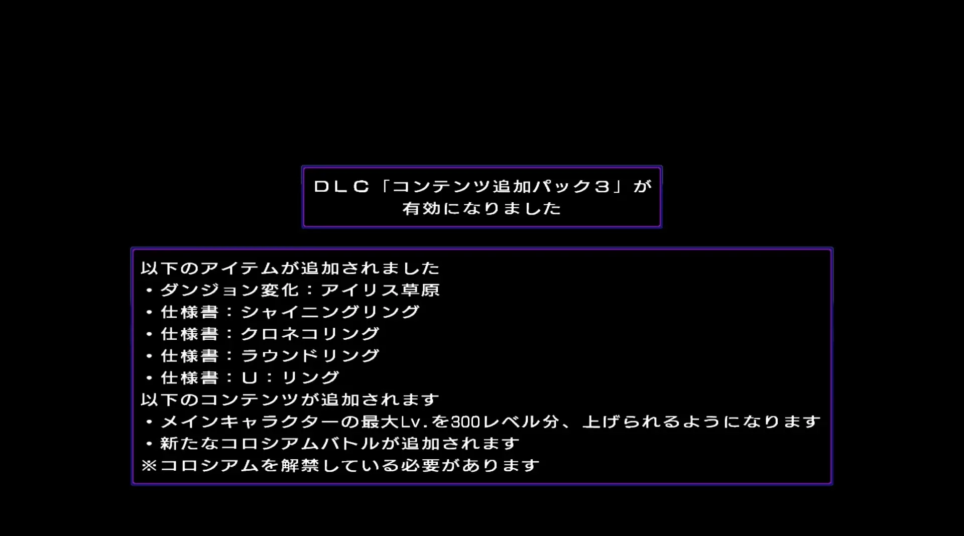 This DLC will add the following items: ・Change Dungeon: Iris Field ・Plan: Shining Ring ・Plan: Black Cat Ring ・Plan: Round Ring ・Plan: U Ring It will also add the following content: ・Increase the level cap by 300 ・A new Colosseum battle is available