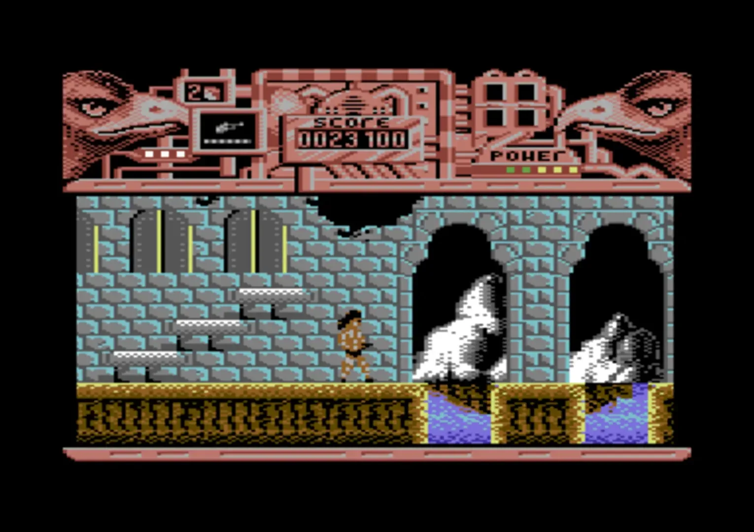 A bi-directional horizontally scrolling platform game, Hawkeye has the player in control of an SLF (Synthetic Life Form) controlled from an underground bunker by the Xamoxians. On each level, the eyes of the hawks in the status panel flash to indicate the direction to travel in to find a puzzle piece. Four pieces are needed to complete the level, but there were also other pickups such as ammo and energy. There were 12 levels to complete plus a hidden bonus level. The player has a choice of four different weapons. The basic pistol had unlimited ammo but did little damage. The machine gun had a faster rate of fire, the laser did more damage and most powerful of all was the rocket launcher - but all three soon ran out of ammo. The game features parallax scrolling backgrounds and large numbers of enemies (including large rhinos, triceratops and gorillas).