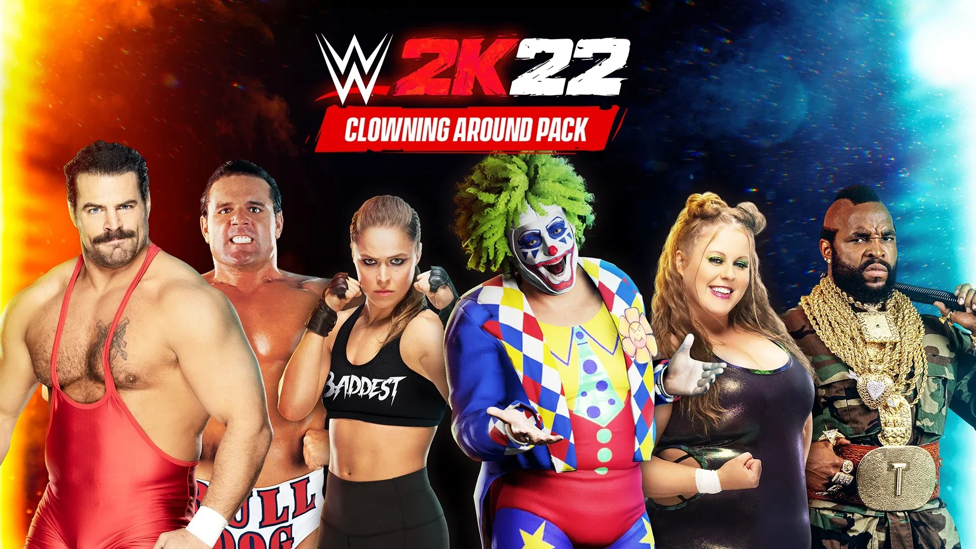 The Clowning Around Pack features Doink the Clown, Ronda Rousey, Rick Boogs, Mr. T, Doudrop, and The British Bulldog. Each playable Superstar also comes with their own Evo MyFaction card.