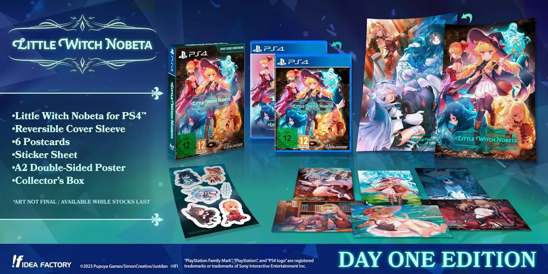 The Day One Edition of Little Witch Nobeta includes: - The game - A reversible cover sleeve - 6 Postcards - A Sticker Sheet - An A2 Double-sided Poster - Collector's Box