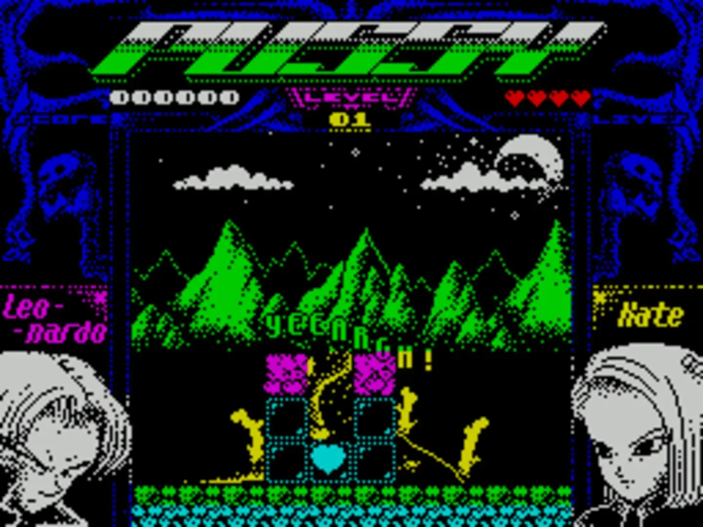 Pussy: Love Story from Titanic is a single player game which contains platform and falling brick puzzle solving elements. Gameplay is similar to the game Popils. The story behind the game is that Leonardo won a ticket to travel on the Titanic's maiden voyage. There he met the girl of his dreams, Kate. However Kate was rich and Leonardo was poor and worse, a thief. Their love was forbidden. The game consists of a series of fifty puzzles in which the objective is to get Kate & Leonardo to meet. Kate is usually on top of a parapet or trapped behind a wall shouting 'Help' and the player must guide Leonardo to her. To solve these puzzles Leonardo can climb ladders and, with his mighty fist, he can smash bricks. Smashed bricks disappear and the bricks above them will fall down to take their place. Some bricks are hollow and cannot be smashed, others will explode. The game also features teleports, which the manual assures were a common feature on the original Titanic, enemies to deal with, and two lengthy platform sequences where Leonardo must traverse the length of the Titanic. Passwords are used to enable games to be restarted at later levels.