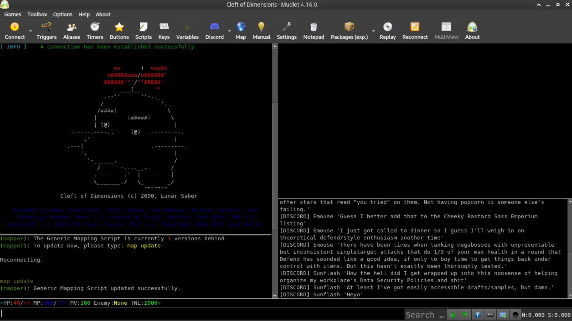 The Cleft of Dimensions is a text adventure MMO (aka, a MUD) with content inspired by classic video games. Do you want to jump on goombas? Maybe you'd rather immolate them with lava or bombard them with meteors. You could always confuse them into hitting themselves. Then again, why fight goombas when you could enslave them into your army? If that doesn't work out, you've got this motorcycle you could crash into them. The Cleft has 16 character classes, each with a different play style. Gameplay in the Cleft is as much about exploring as it is about killing things. Secret treasure is hidden everywhere, waiting to be claimed by those willing to endeavour. Quests are prominent, with activities ranging from committing industrial espionage for a paranoid innkeeper to seeking the blessings of the mana spirits. To top it all off, we have an active roleplaying community to make your own story part of the Cleft.