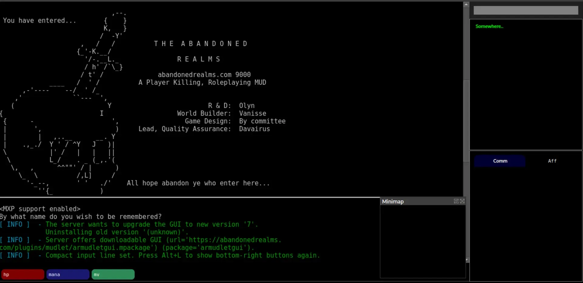 The Abandoned Realms MUD is a fully-featured multiplayer experience with roleplaying and playerkilling. As you play the game, you will make both great friends, and vicious enemies - all real people who are playing alongside you!
