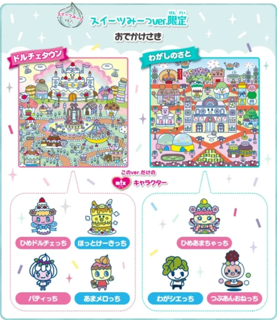 The Tamagotchi Meets: Sweets version was released in Japan in November 2019. It features two new locations and seven new and returning characters: Dolce Town (Amamelotchi, Himedolcetchi, Hotcaketchi, and Patitchi) and Wagashi Village (Himeamachatchi, Tsubuanonetchi, and Wagassiertchi).