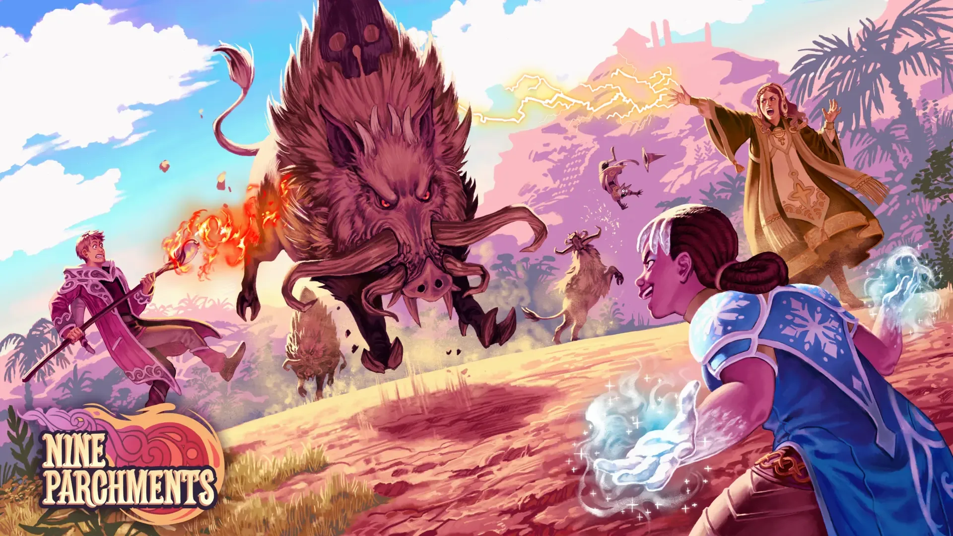 Nine Parchments is a co-operative blast'em up game of magic mayhem from Frozenbyte! Runaway apprentice wizards seize the opportunity to complete their spellbooks by going after the lost Nine Parchments. As the would-be wizards rapidly acquire powerful new spells without learning proper safety measures, it's natural their hasty progress results in plenty of deadly accidents... Nine Parchments combines real-time spell-shooting action with RPG elements - level up your character and collect magical loot, filling your wardrobe with a myriad of wizard hats and powerful staves.