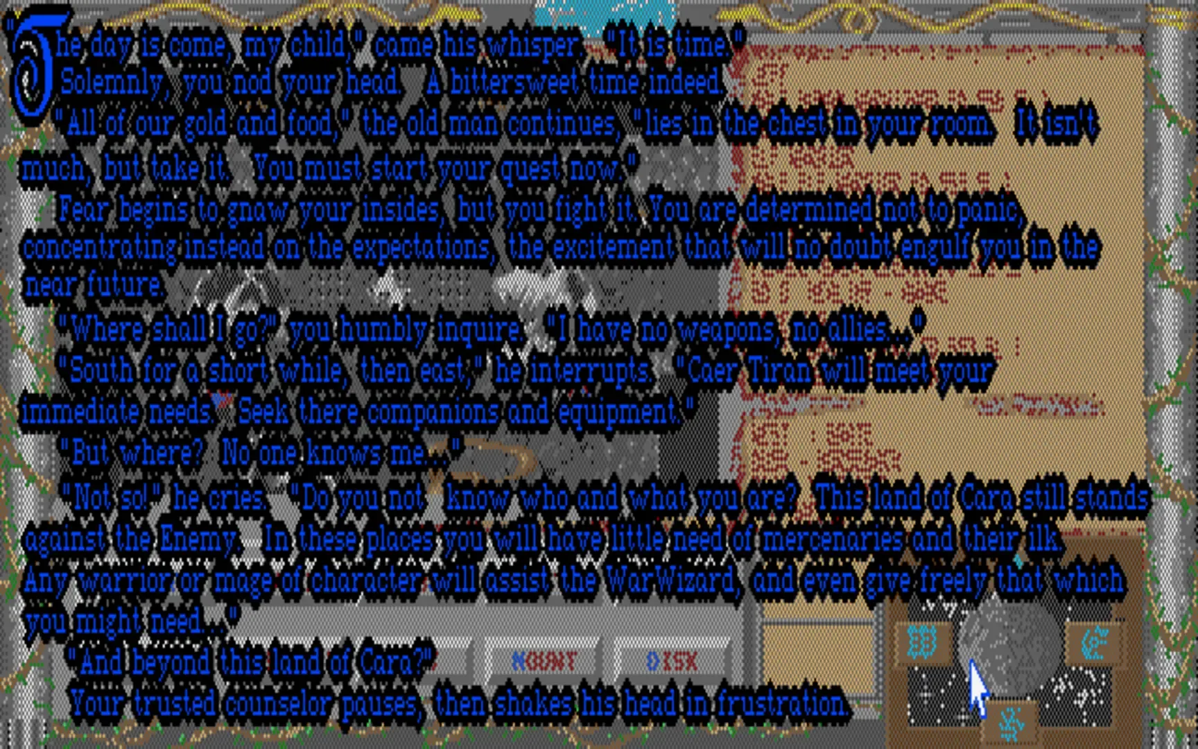 WarWizard is a role-playing game in a medieval fantasy setting. The player takes on the role of a WarWizard, a powerful character skilled both in combat and magic arts. As the story goes, a Dark WarWizard rose to rule the land. It is the player's task to recover the Ancient Armor that was used to defeat the previous dark WarWizard, and rid the land of the current menace. The player starts alone and must build up his skills and acquire equipment and resources. Eventually, up to three other characters may join the player's party.