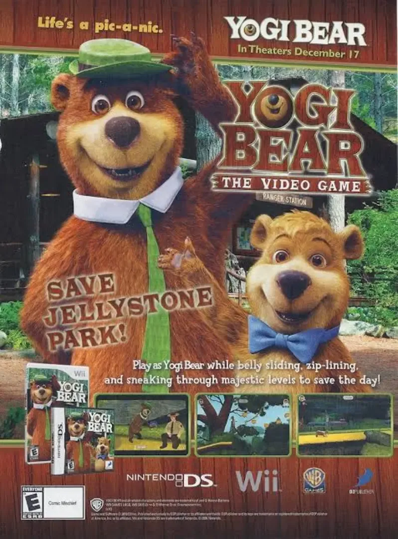 The 100th Anniversary of Jellystone Park is fast approaching - and land developers want to shut it down! Based on Warner Bros. Studios live-action CG animated feature film Yogi Bear, Yogi Bear: The Video Game lets players become "smarter than the average bear" while exploring the park as Yogi. Belly slide, zip-line, bungee, and sneak through majestic levels, all the while rescuing protected animals and finding a way to save Jellystone Park from shutting down forever!