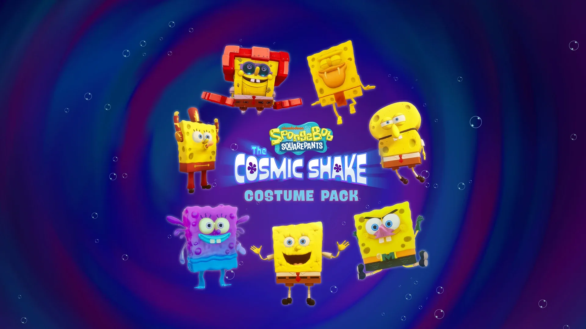 The Official Cosmic Shake Costume Pack, including 7 additional SpongeBob costumes! Pizza glide as Opposite Day Bob or karate kick as Band Geek while you make your way through this brand-new SpongeBob adventure.