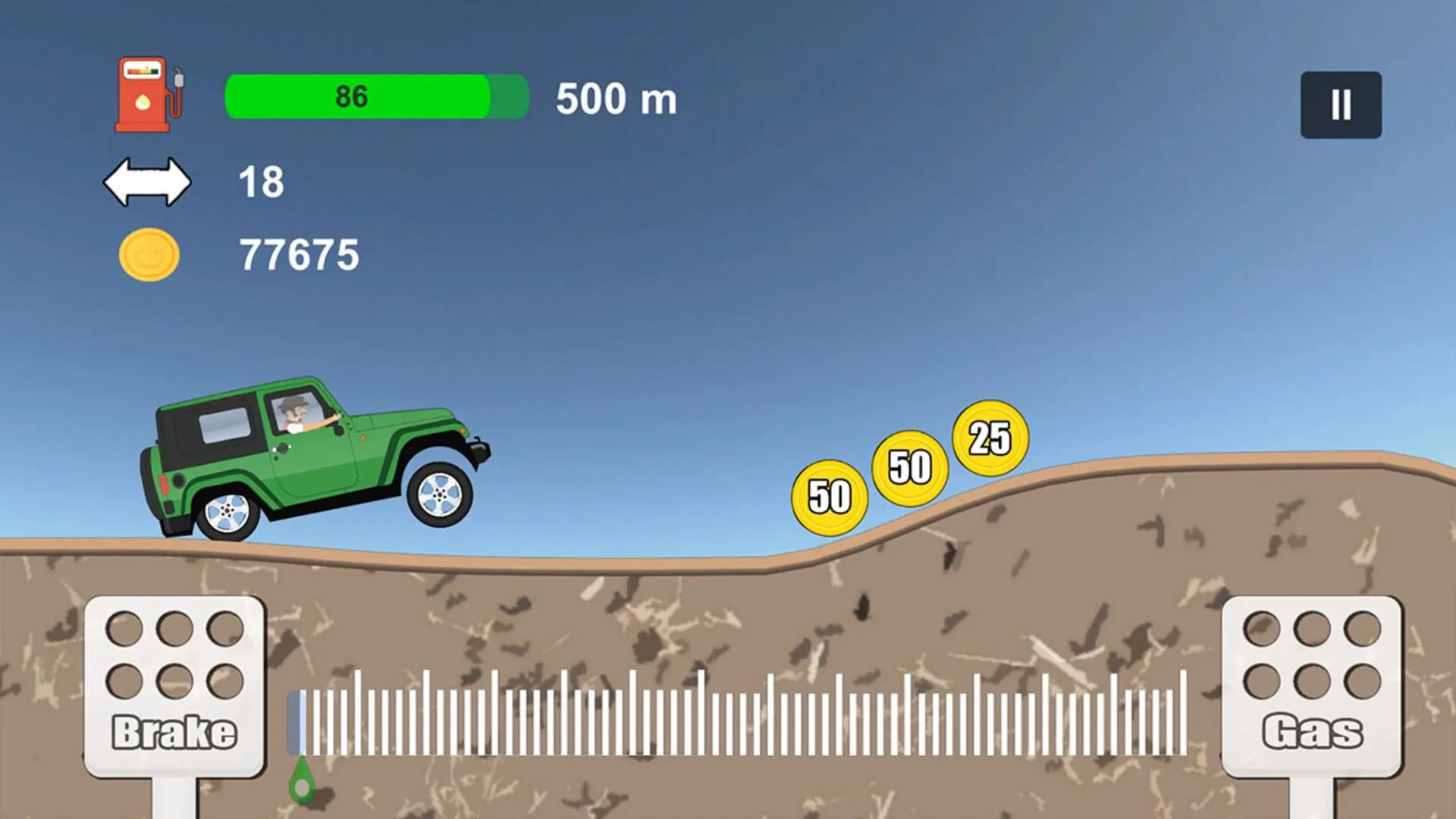 'Hill Climb' is a car parkour game. Players can control different cars to play the game. When the car touches gold coins, they can get extra points.