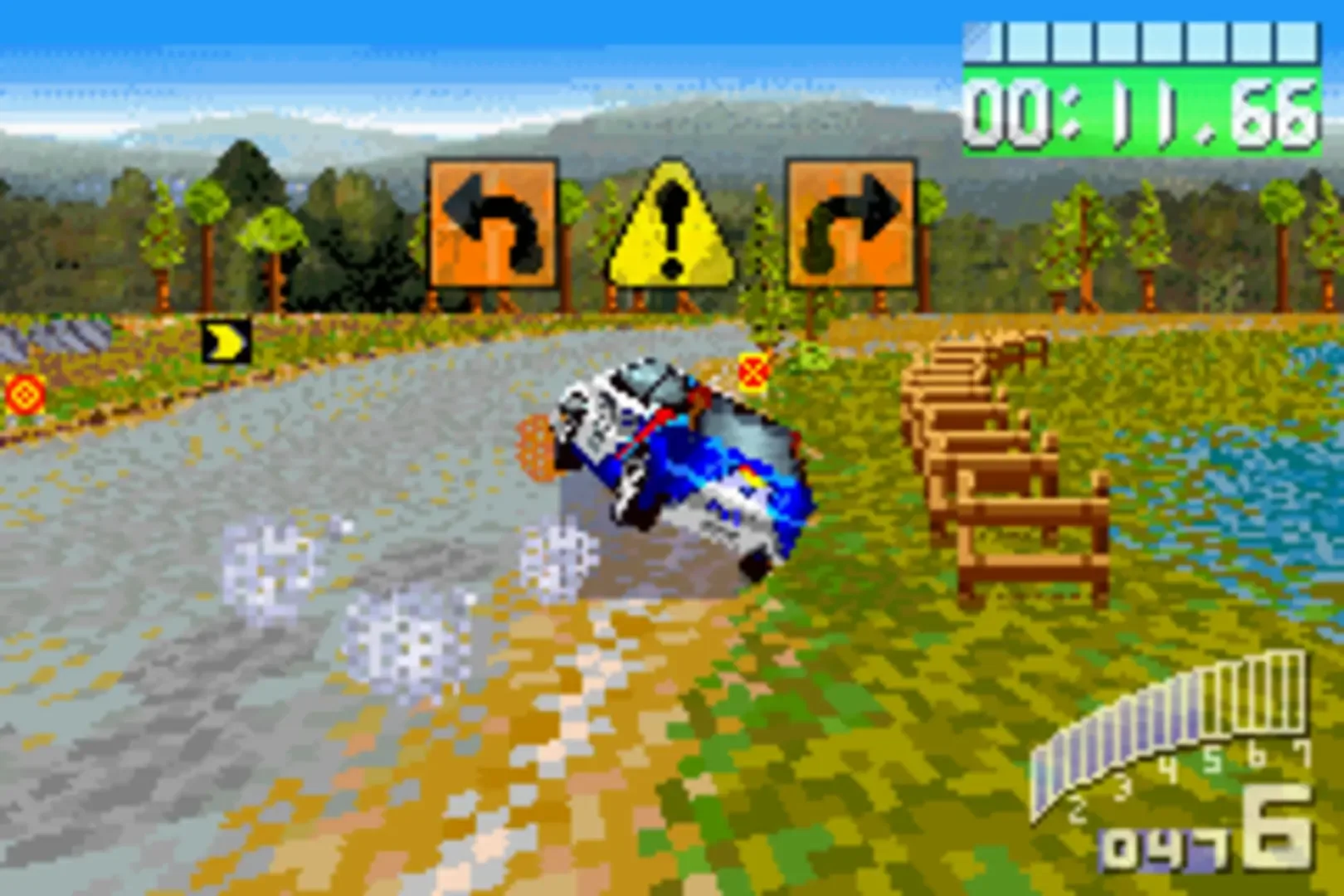 Colin McRae Rally 2.0 on the Game Boy Advance adapts the gameplay of the PC/console title to the handheld's capabilities. The game features five licensed cars (Ford Focus, Mitsubishi Lancer, Toyota Corolla, Subaru Impreza, Ford Puma) and tracks in six different countries (Finland, France, Sweden, Australia, Kenya, United Kingdom). The game's main rally mode takes the player through a championship, with each of the six countries' rally tracks consisting of six stages each. The game takes the simulation approach, with the player being able to adjust suspension, gearbox, steering, tyres and more to fit driving style and road conditions. Damage acquired during a race must be repaired between stages at the expense of time. Besides driving the full championship, it is also possible to practice single rallies and even single stages - a time trial mode for single stages is also available. Tracks not available to be selected from the beginning must be unlocked by winning the championship first. Besides rally mode, the game also offers arcade mode, which features six tracks for conventional circuit racing. The circuits can be driven as time trials, single races or a championship. This mode also supports multiplayer via the link cable, only requiring a single cartridge. During racing, the track is displayed via a Mode-7-style scaling/rotating bitmap engine, with the cars rendered as texture-mapped polygons. During rally races, the game features a co-driver calling out road features ahead via digitized speech, which is provided by Colin McRae's actual co-driver Nicky Grist.