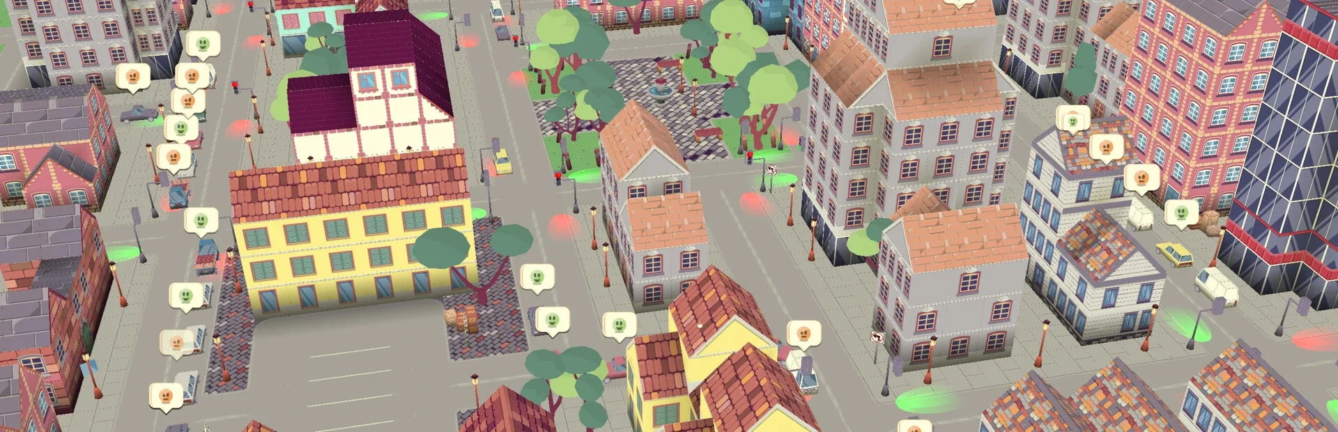 Fix urban traffic issues by placing road signs and programming traffic light patterns. Create green lanes, and divert traffic!