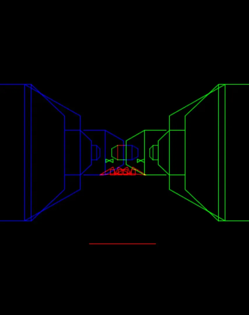 The goal in 3D Narrow Escape is to successfully navigate a ship through the narrow, fast-moving passages of the warlord's fortress, destroy the defense forces and avoid space debris. The player's ship must also be maneuvered through small holes in a series of walls where fuel cells can be picked up to restore the ship's constantly decreasing fuel supply. If the player pilots their ship successfully, they will be faced with the warlord's own escape ship which must be hit several times to be destroyed, liberating the star system from the warlord's tyranny. Each level becomes more difficult as everything will move faster, fuel will be consumed more quickly, the holes in the walls will become smaller, and more menacing defense forces will appear. Each level of game play consists of two phases: 1. Passages: During the first phase of each level, the player must maneuver their ship through the narrow, moving passages with the joystick while shooting six of the warlord's defense forces with button 4. If any of the six are missed, they will go off-screen and be recycled to give the player another chance, but more fuel will be used. In addition to various defense forces which must be destroyed, there are extra targets that can be shot for additional points. Unlike the regular defense forces, the extra targets are non-threatening in that they will not shoot or crash into the player's ship. During this phase, space debris will also be shooting up through the play field. Space debris cannot be shot and can only be avoided by dodging it by moving from side to side. The walls of the narrow passage are also a danger to the player. If the player's ship crashes into a wall, a life will be lost. There are gaps between the moving walls which the player can maneuver quickly into and out of so as to avoid approaching enemies or space debris, however as game play becomes faster this will present a higher risk to crashing into oncoming walls. 2. Walls: If the passages are successfully navigated and the the required six defense forces are destroyed, the player will enter the second phase. This is a series of walls with holes. In the first level of the game, there are five successive walls, each with one hole through which the player must maneuver their ship. In the second level of play, there will be six successive walls, in the third level, seven walls, etc. Also the size of the holes will become smaller in each new level. The hole will be in a different location on each wall. After passing through the hole in each wall (but prior to entering the hole in the next wall) there will be a fuel cell which must be passed to pick up. If the fuel cells are missed, the game will continue, but the fuel gauge will be continuously depleting. Note: in early levels of the game, all of the fuel cells will not need to be captured. However as the game progresses and fuel is consumed faster, all of the fuel cells will need to be captured in order to make it through the next level. After successfully completing three levels of play, the player will come face-to-face with the warlord's escape ship in open space. The warlord's ship must be shot five times to be destroyed during the first encounter, seven times on the next encounter, nine times the next, etc. The warlord's ship will shoot torpedoes at the player's ship, which can be either avoided or shot at to be destroyed. If the warlord's escape ship is destroyed, the player will enter the next level of play and the game will continue.