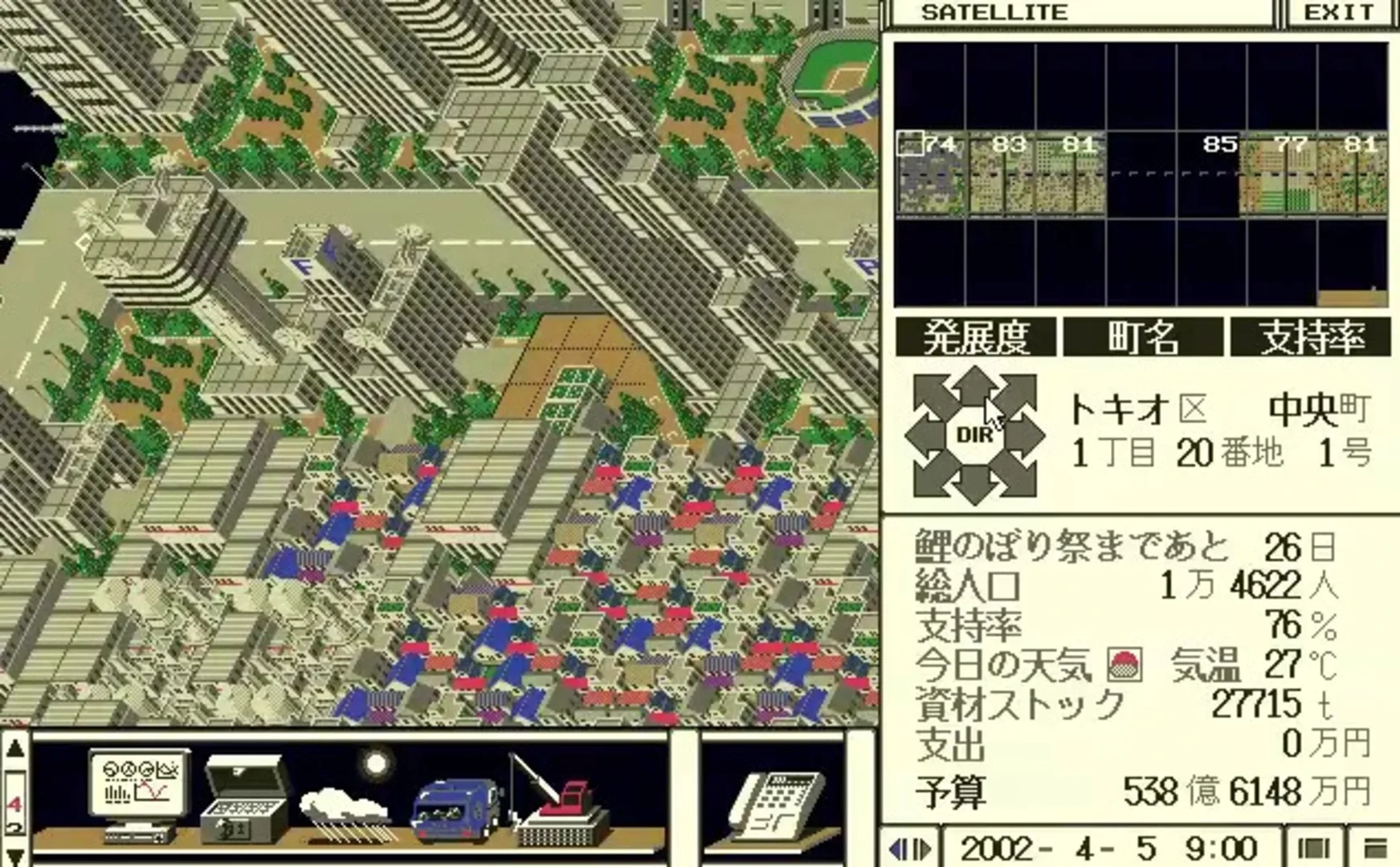 Tokio: Tokyo-to Dai 24-ku of Tokyo is a sci-fi city simulator from Artdink, the company behind the A-Train economy sim series. Playing it will require careful planning, improvisation, and correspondence with your city's constituents to fix problems and make everyone happy. You can personally telephone residents to hear their opinions, or even tune in on various TV channels to survey Tokio. Every little counts: your political party platform, the techno-industrial automation needed to power Tokio & its economy, and even space tourism via space shuttles and other programs—among others! Elements like artificial gravity, weather control, and orbital mining can also make or break your term as mayor, so manage it all to the best of your ability.