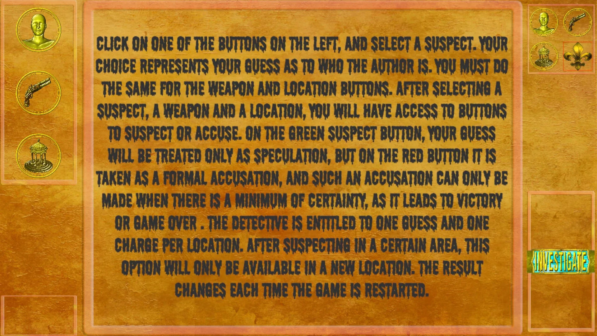 Investigation and horror game, where the player becomes a detective and seeks clues to unravel a mysterious case that took place years ago. Whenever the player restarts the game, the clues change position. The crime scene, weapons and culprits are also changed with each new match started.