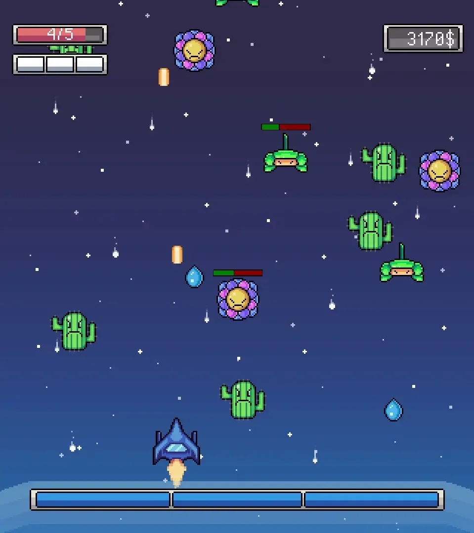 Planet Earth is running low on resources and your goal is to help the cargo spaceship, named Mother Ship, reach Planet Earth. You are in hostile territory and will be attacked by all kind of alien enemies such as flowers, mushrooms and weird Lovecraftian creatures.