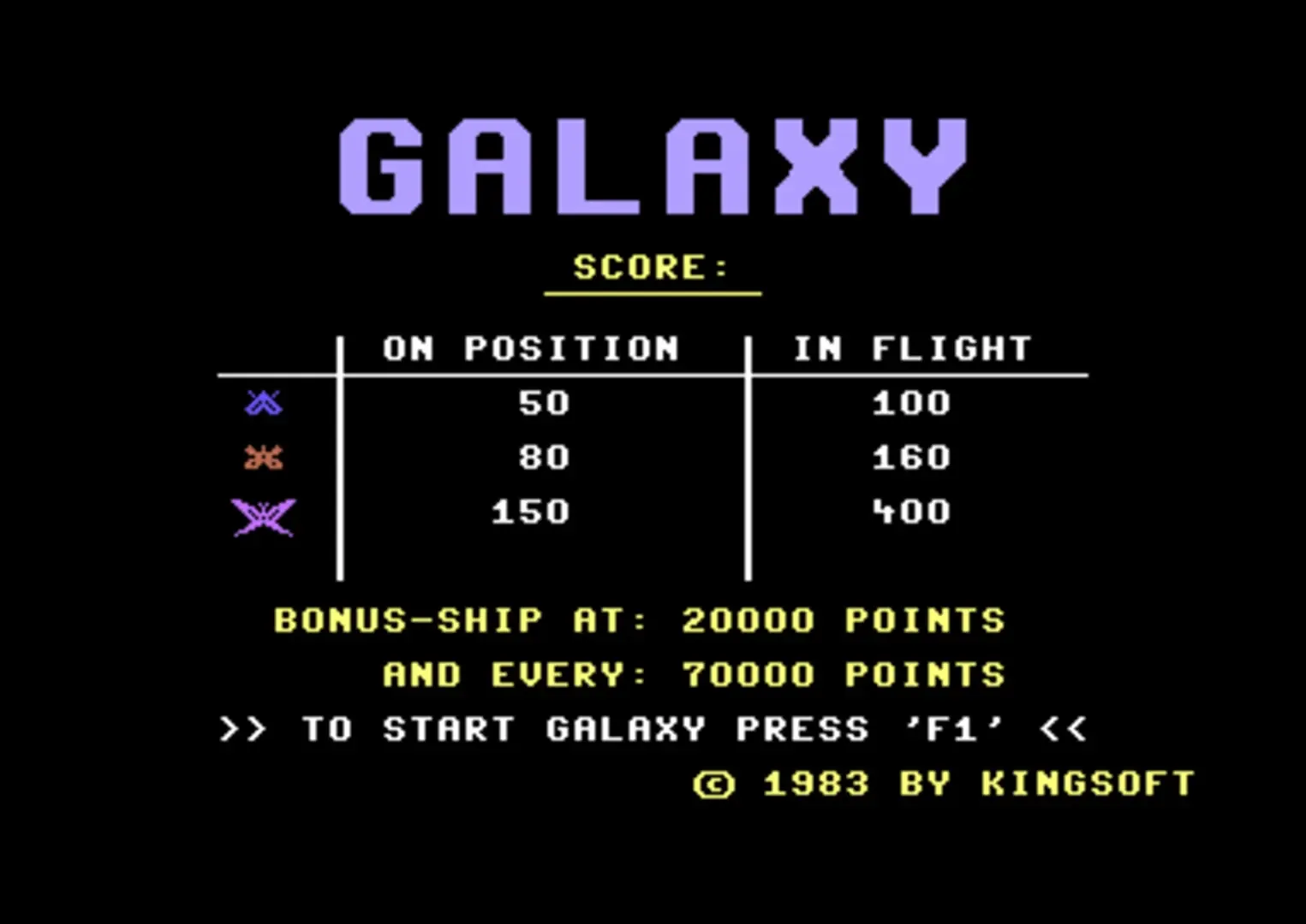 Galaxy is a Galaga variant that builds on the ideas explored in the Commodore PET game Galaga, an earlier unlicensed take on the coin-up game by Henrik Wening. Players move a space ship left and right to fire at a group of alien ships near the top of the screen. They fire bullets and come swooping down like a kamikaze. Based on the colour they have different behaviour and some of them require multiple hits. To finish the stage all aliens have to be defeated. The wave is repeated in every stage, but enemies gradually become faster. Just like in the regular Galaga, the largest enemies can move down and fire a fixed beam that makes the area smaller to move. After a number of stages a Challenge Stage can be accessed with a new pattern. The player receives a bonus there based on the number of kills. You start with three lives. A bonus ship is awarded at 20,000 points and then at every 70,000 points.