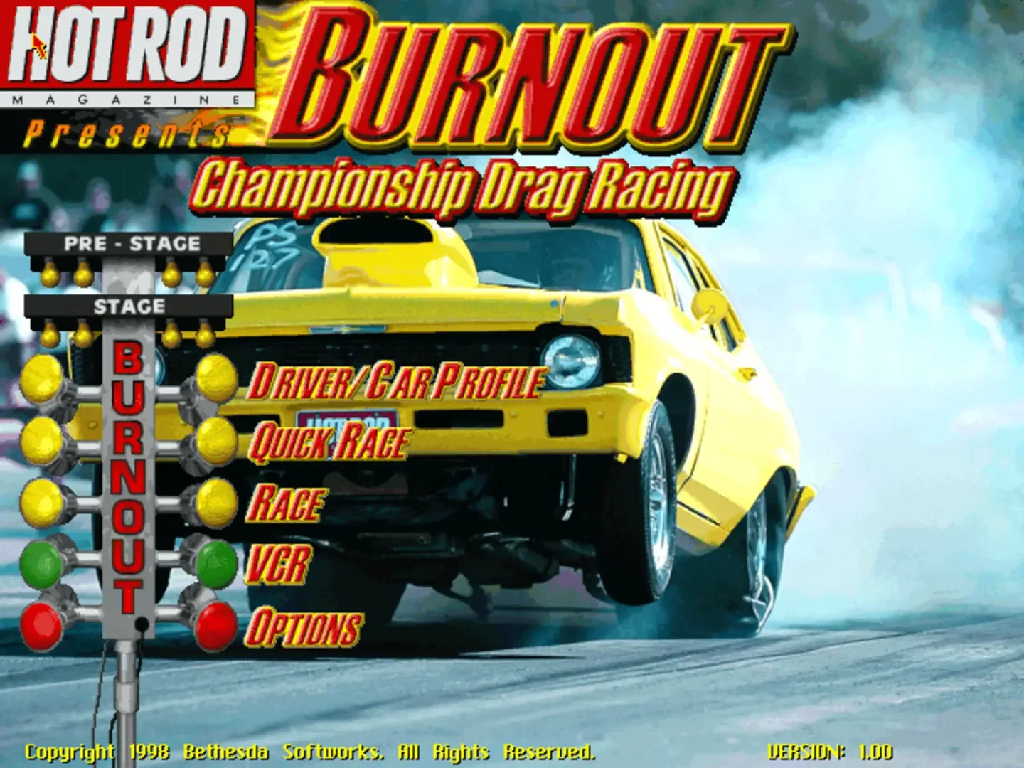 Burnout is a racing simulation devoted to the world of drag racing. You fine-tune your car in the hopes of then being able to send it at insanely high speeds in short, linear tracks. And this is what makes the bulk of the game, a dizzying array of customization options are available for you to construct the perfect hot-rod, essentially making it a "grease monkey" simulation. Additional features include bracket racing (where you select an estimated time based on your practice runs, and try to meet it against other cars), quick race and a complete season against 64 computer controlled cars. Also available is multiplayer racing through modem, LAN or internet. The graphics engine is a suped-up version of the X-Car engine, and supports 3D acceleration with all sorts of nifty effects such as smoke, sparks, tire distortion, etc.