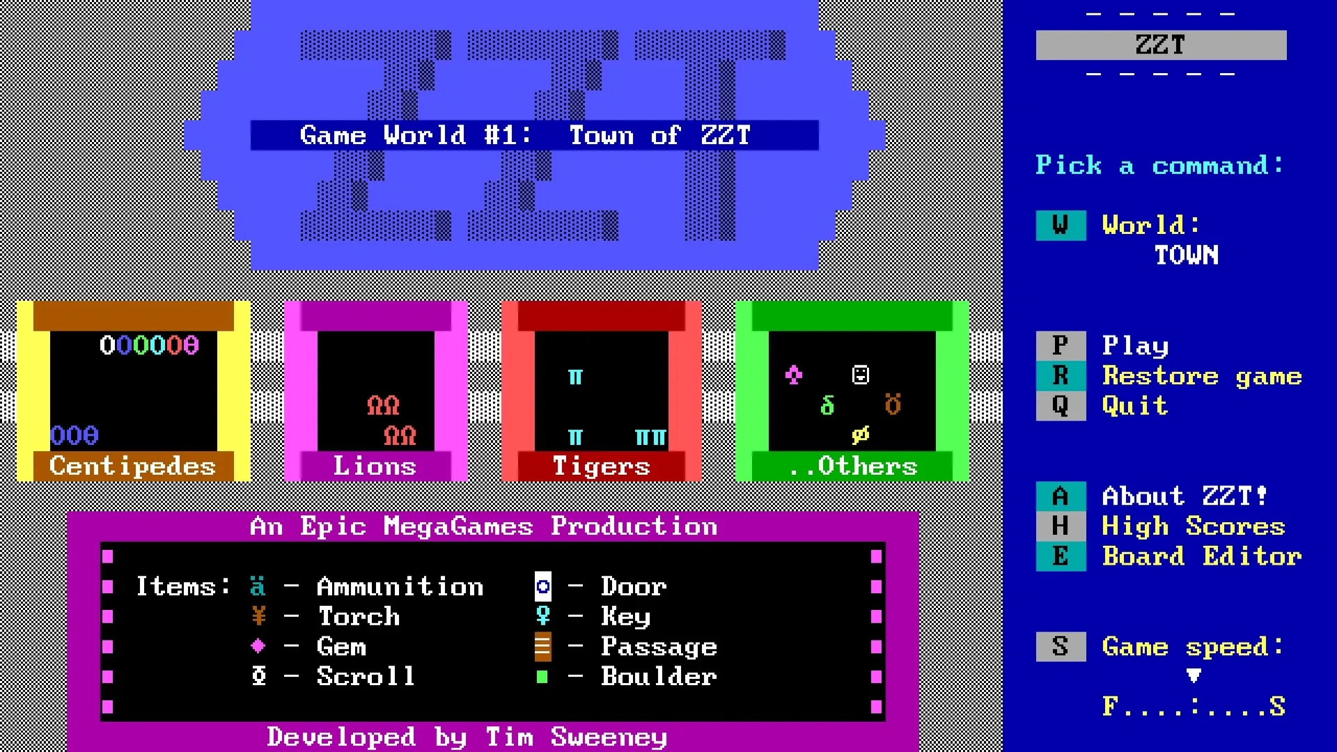 A DOS-based ASCII game creation program. Built for simple, top-down shooter or adventure games, with a built-in object-based programming language for added complexity.