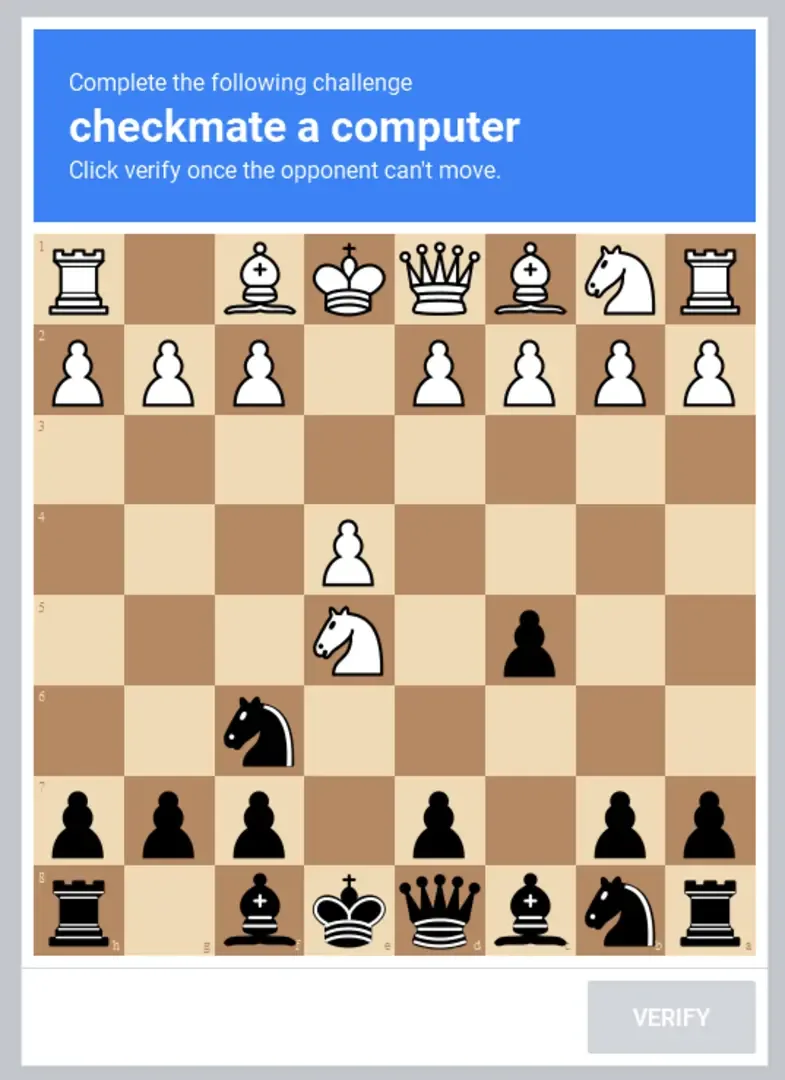 A parody ReCaptcha in which you play chess against an AI to prove you are not a robot.