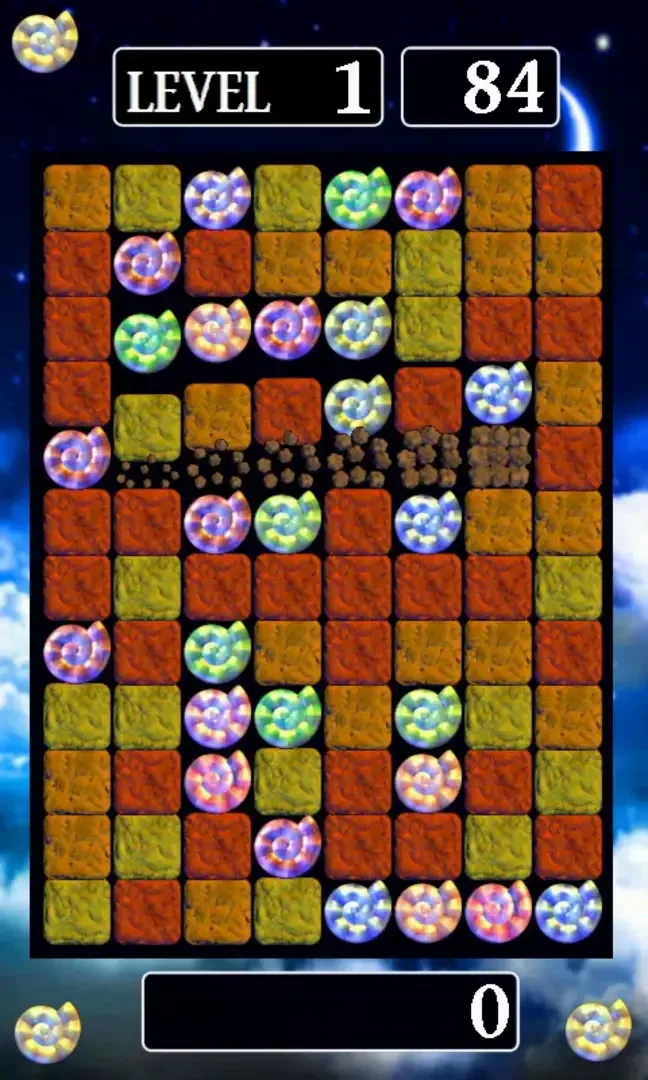 It's a shell of a game! Get ready for some fast-paced shell breaking action! Drag your finger across unwanted dirt tiles to make them crumble, letting your shimmering shells fall into place! Line them up in horizontal rows for points and more time! Touch a "B" icon to destroy all blocks of that color. Touch a "C" icon to turn all blocks of that color into shells!
