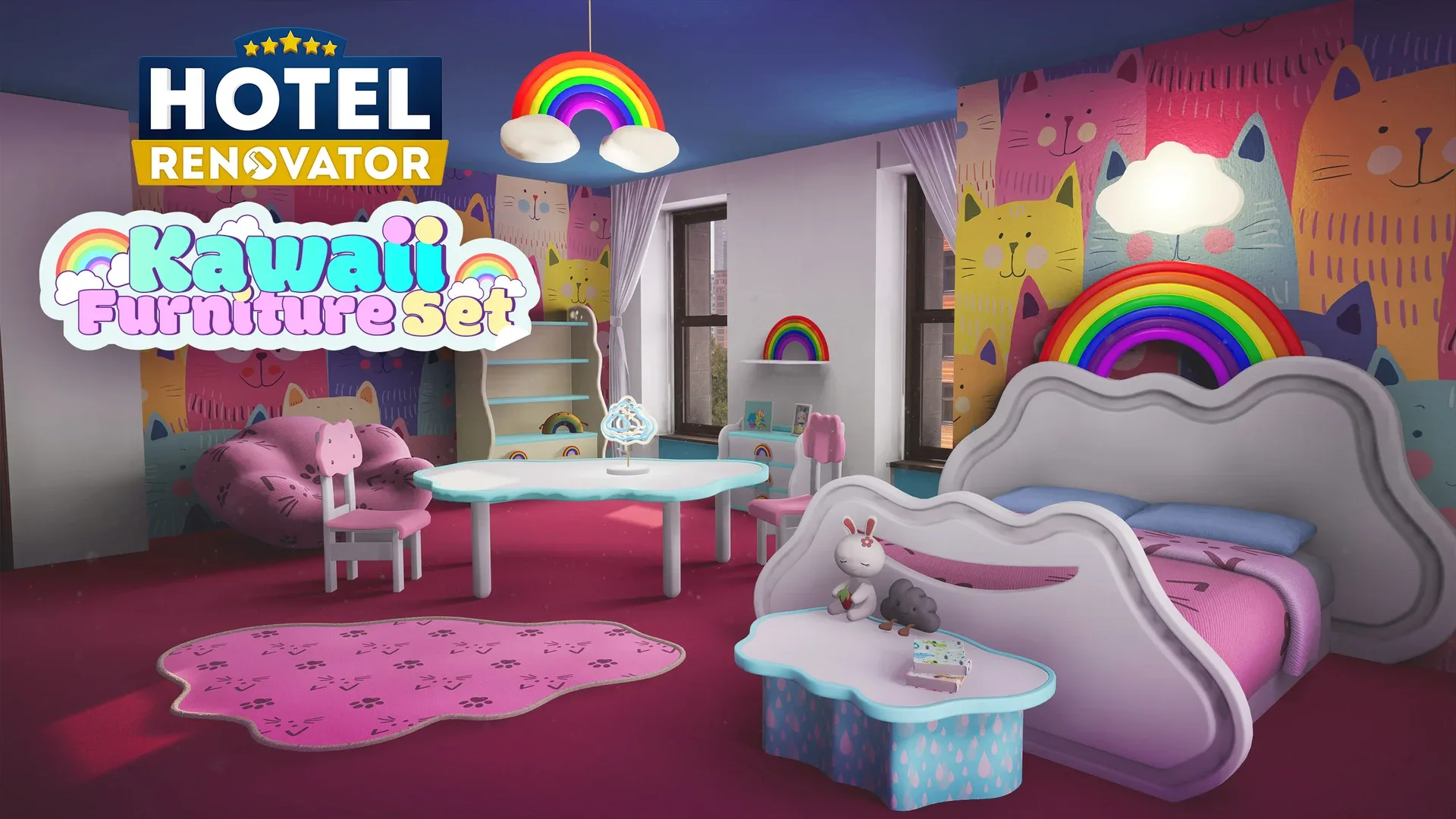 Invite your guests on the most adorable stay with the Kawaii Furniture set.Give your hotel that youthful glow with the Kawaii Furniture set, packed with the cutest 53 items that will make any of your customers' heart melt. With its bright colors and playful patterns, life truly is all sunshine and rainbows!