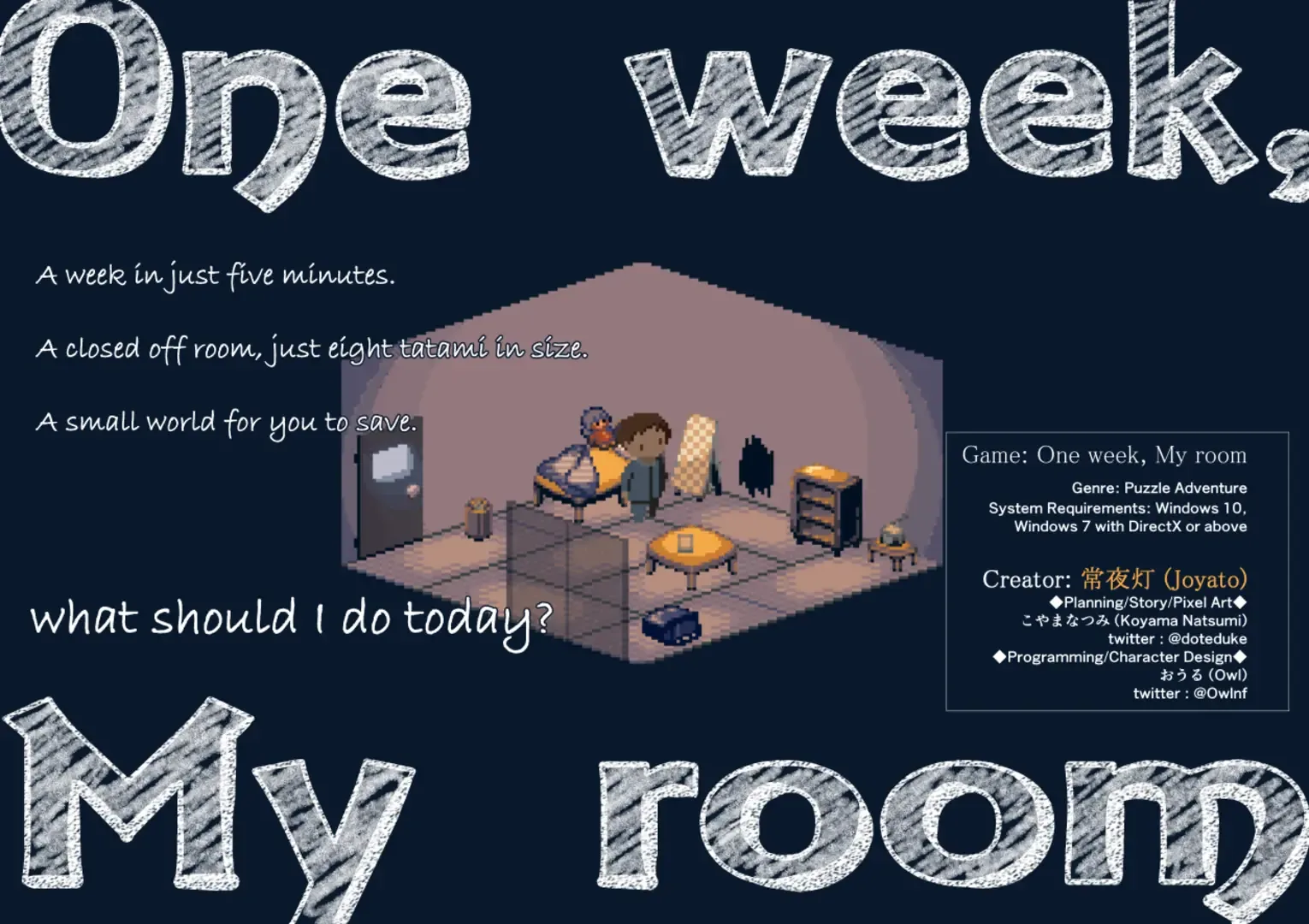 A week in just five minutes. A closed off room, just eight tatami in size. A small world for you to save. This game is a puzzle adventure that takes from thirty minutes to an hour to play through.
