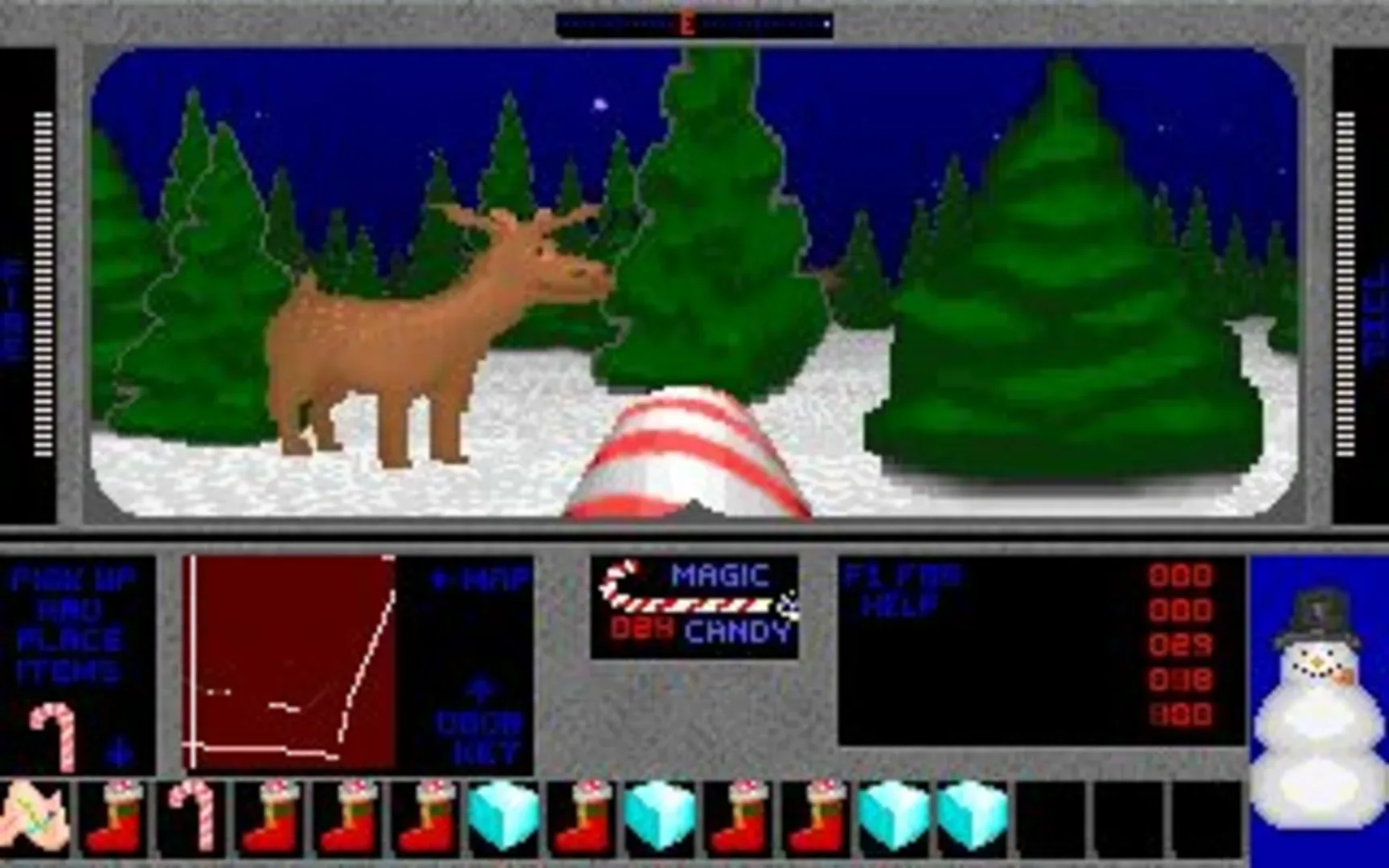 Armed with a magic candy cane that shoots jingles and sprinkles, you run around the North Pole gathering gifts, freeing grounded reindeer, and thawing out elves. Beware of the growling abominable snowmen and the menacing grinchy creatures!