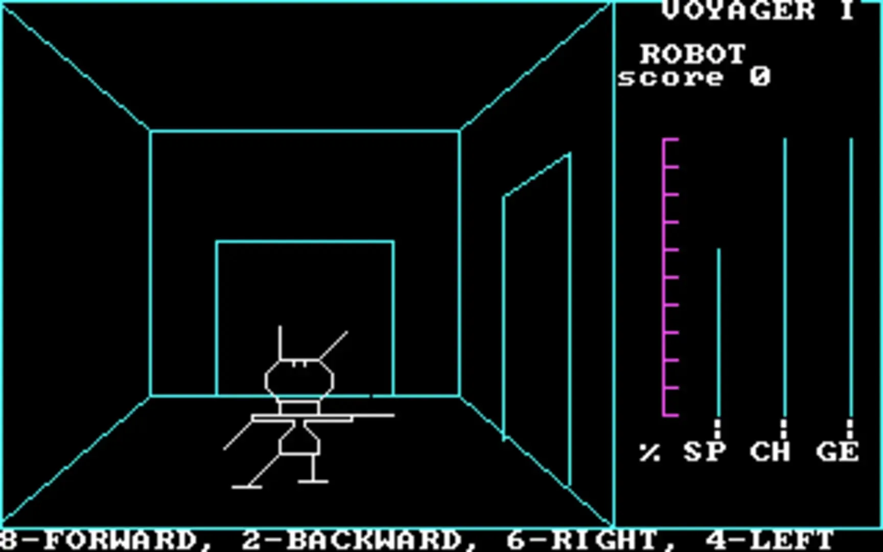 Voyager is a first-person action game that challenges the player to explore the levels of an alien spacecraft's maze. The environments consist of corridors and rooms done with 3D vector graphics. The protagonist has to evade robots programmed to blast any intruders. To win, the player must destroy all power generators and escape (or hunt down and annihilate) the killer robots.