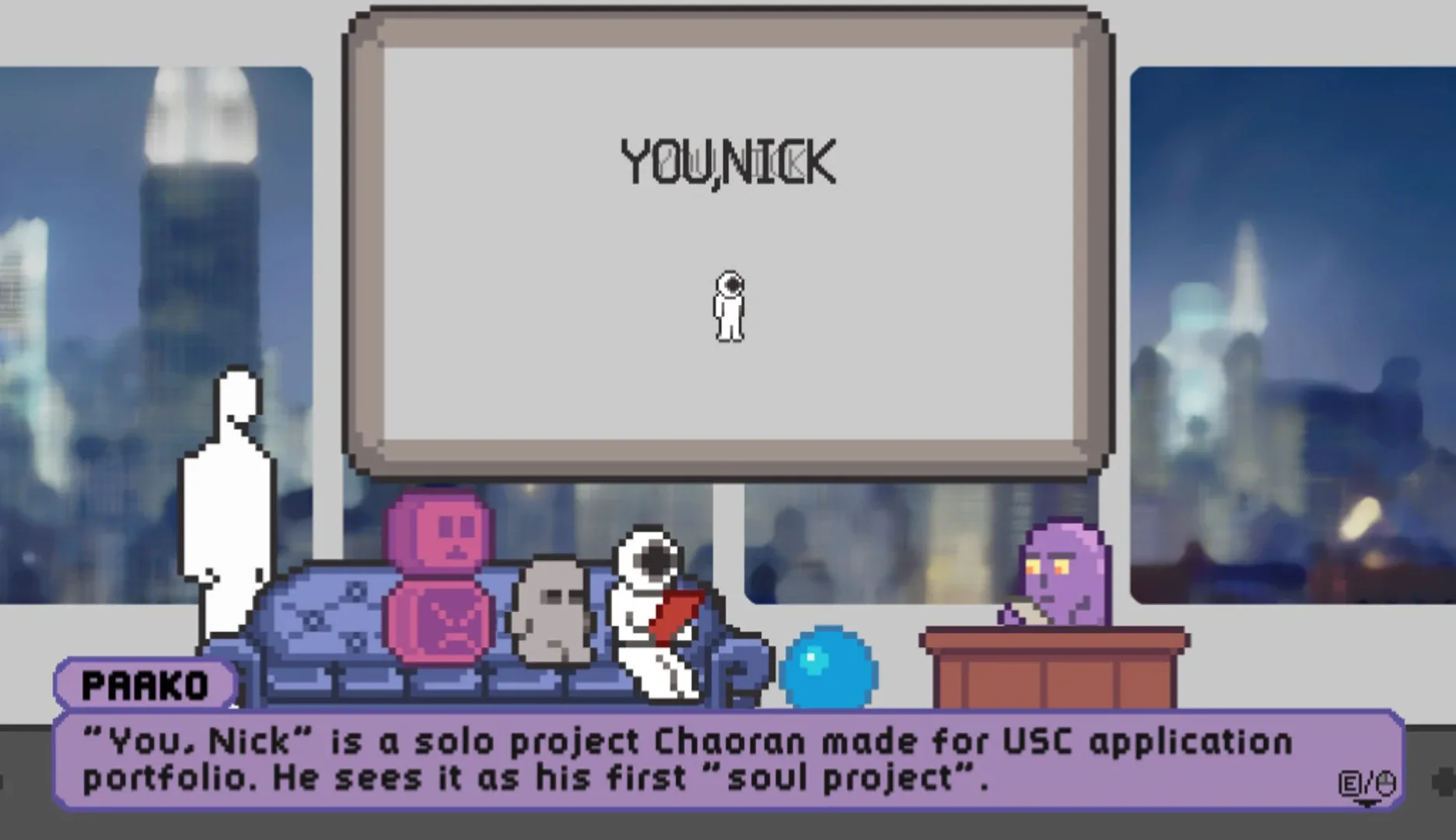 A Game Called Paako is a pixel-art 2D platformer metagame that tells the story of a game major grad student named Chaoran making his thesis game project A Game Called Paako.