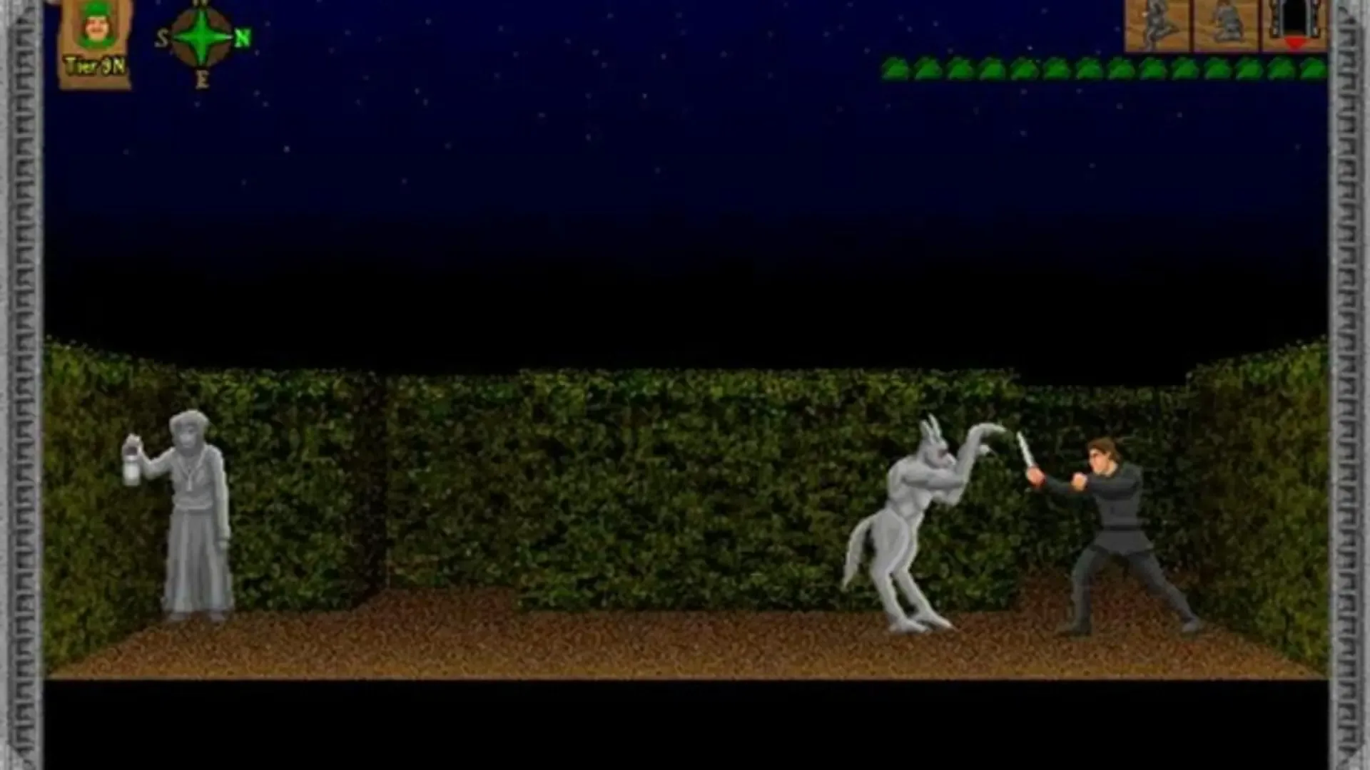 Similar to Prince of Persia, there are two major parts of play in Shadows of Cairn, both of which take place in the game itself. There's the platforming aspect of the game where you must guide Quinn over pits and through obstacles by running, jumping, climbing, and even hiding. There's also the fighting aspect of the game where Quinn has to fight enemies to progress by using an assortment of high, medium, or low punches or kicks. Quinn doesn't enter Fight Mode automatically, so if you want him to fight, you need to put him into Fight Mode. Unlike Prince of Persia, however, there are four difficulties to choose from which make the game easier or harder overall. The game ushers you along by issuing way points directly under your Compass, showing you exactly where you need to be heading to progress the story. This could be anywhere from a local tavern to a magical tower on an entirely different tier of the city. Due to this linearity, it's almost impossible to become lost in the game or otherwise stuck. This game also has no inventory system, but there are chests scattered around the world which contain useful items such as Medical Herbs or quest-related items such as the Crazy Guy's Rat which progress the story or can be traded for other items such as new weaponry. As stated, there are four difficulties. In addition to Easy, Normal, and Hard, a fourth difficulty–"Very Easy"–exists which allows you to cheat your way through the game by giving you infinite hit points or even making you complete immune to being hit. There doesn't seem to be any drawbacks to this mode aside from the possibility of getting stuck in certain traps which would otherwise kill you immediately. Lastly, every now and then you'll be treated to an in-game animated cut scene which furthers the story of Quinn. These cut scenes are fully voiced (using tracks from the CD-ROM) and animated, the art style differing slightly from either the cover art or the in game sprites. (The art style is slightly reminiscent of certain Philips CD-i titles' cut scenes.)