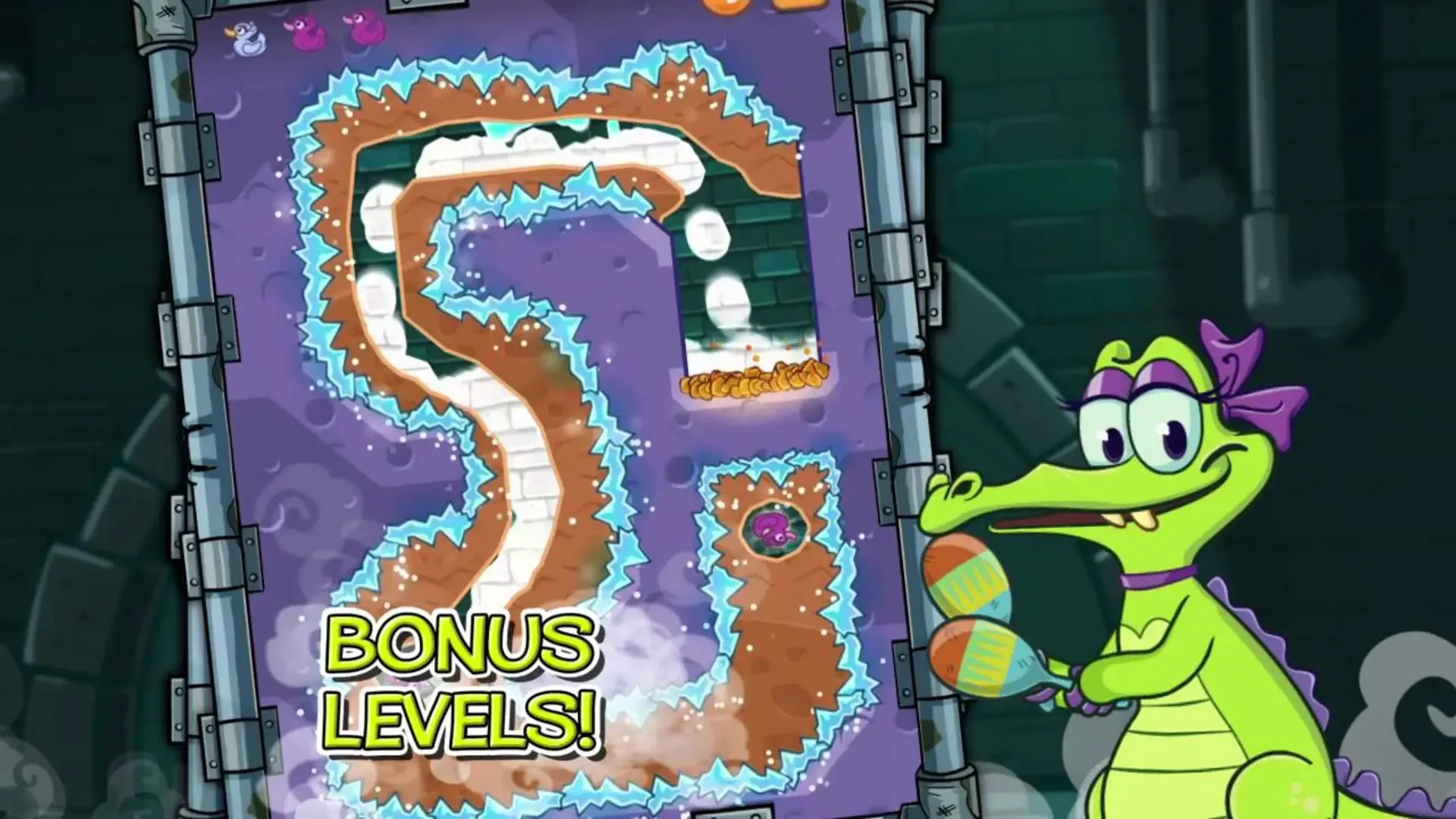 Allie's Story is an optional In-App Purchase that has four chapter and challenges. In this story, the player must help Allie with her broken organ. Allie is the sewer's most creative and talented alligator. Unfortunately, the Other alligators have broken the steam pipe line to her Piano.