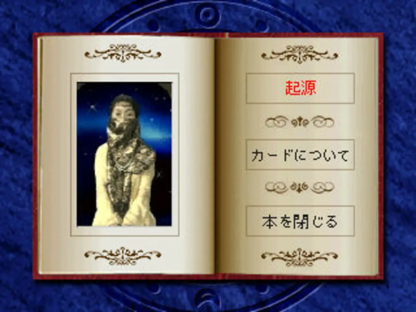 FMV tarot reading game, including a set of cards. The card images are clearly influenced by Aleister Crowley’s Thoth Tarot, whose designs were created by Lady Frieda Harris in the early 1940s.
