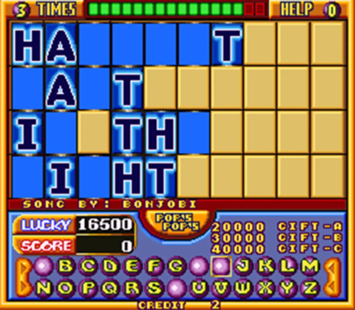 Pop's Pop's is an arcade game by South Korean studio Afega. The goal of the game is to retrieve the title of a song. When the game is launched, the player can select a beginner or mania level. Next a spinning wheel is shown. The player has to press the "stop"-button and the wheel will slow down. When it stops, it is known how many points the player will get if he can guess a letter which is somewhere in the title.