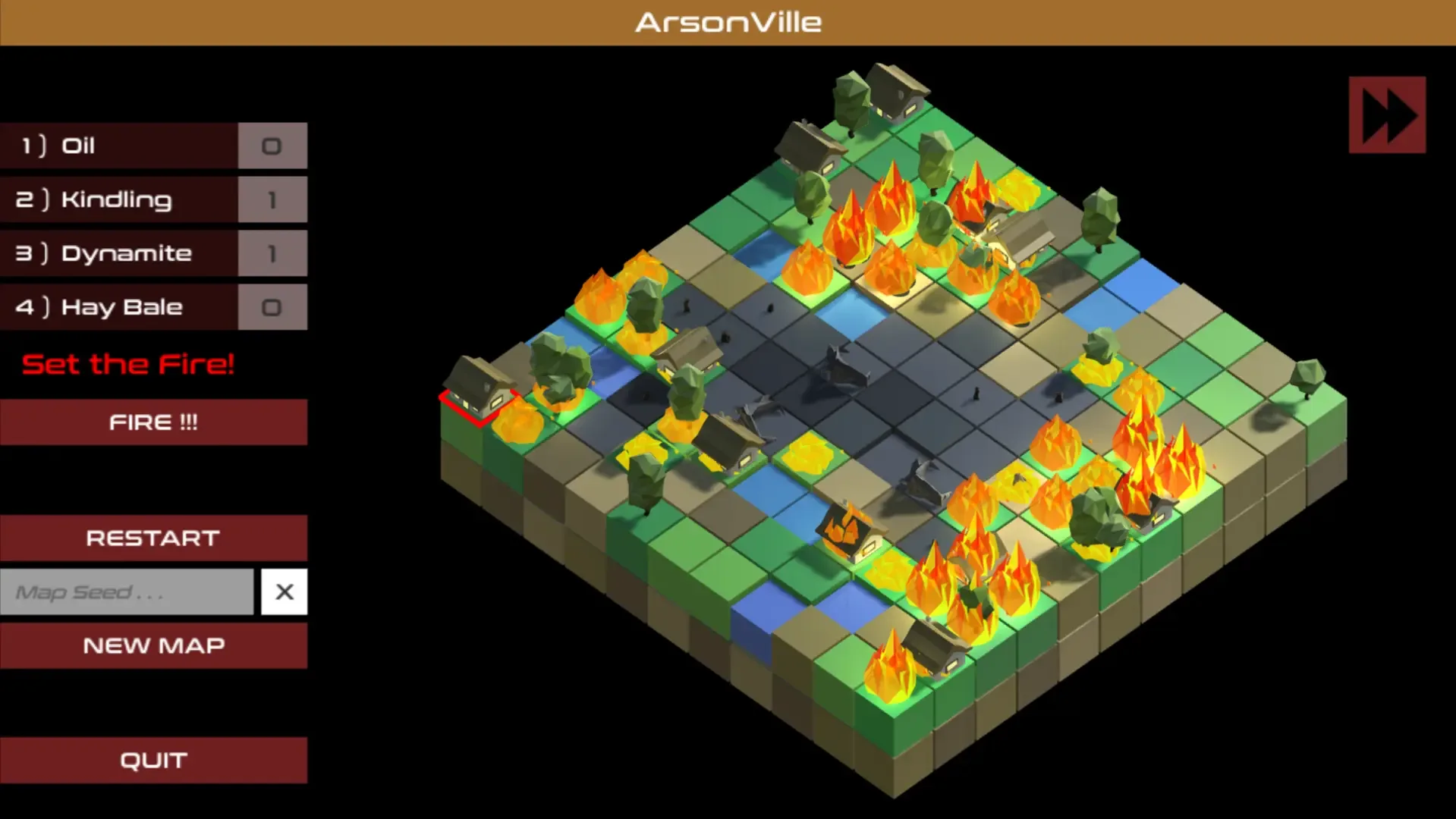 Can you destroy the whole village? You're armed with a small set of fire proliferating goodies, and only ONE chance to start the fire. ArsonVille puts you above a quaint little town, with limited time to place combustible objects around the map, and a single chance to set the fire. Try your best to burn all the tiles, take out the houses and burn down trees. A calming, relaxing, yet slightly disturbing casual game.
