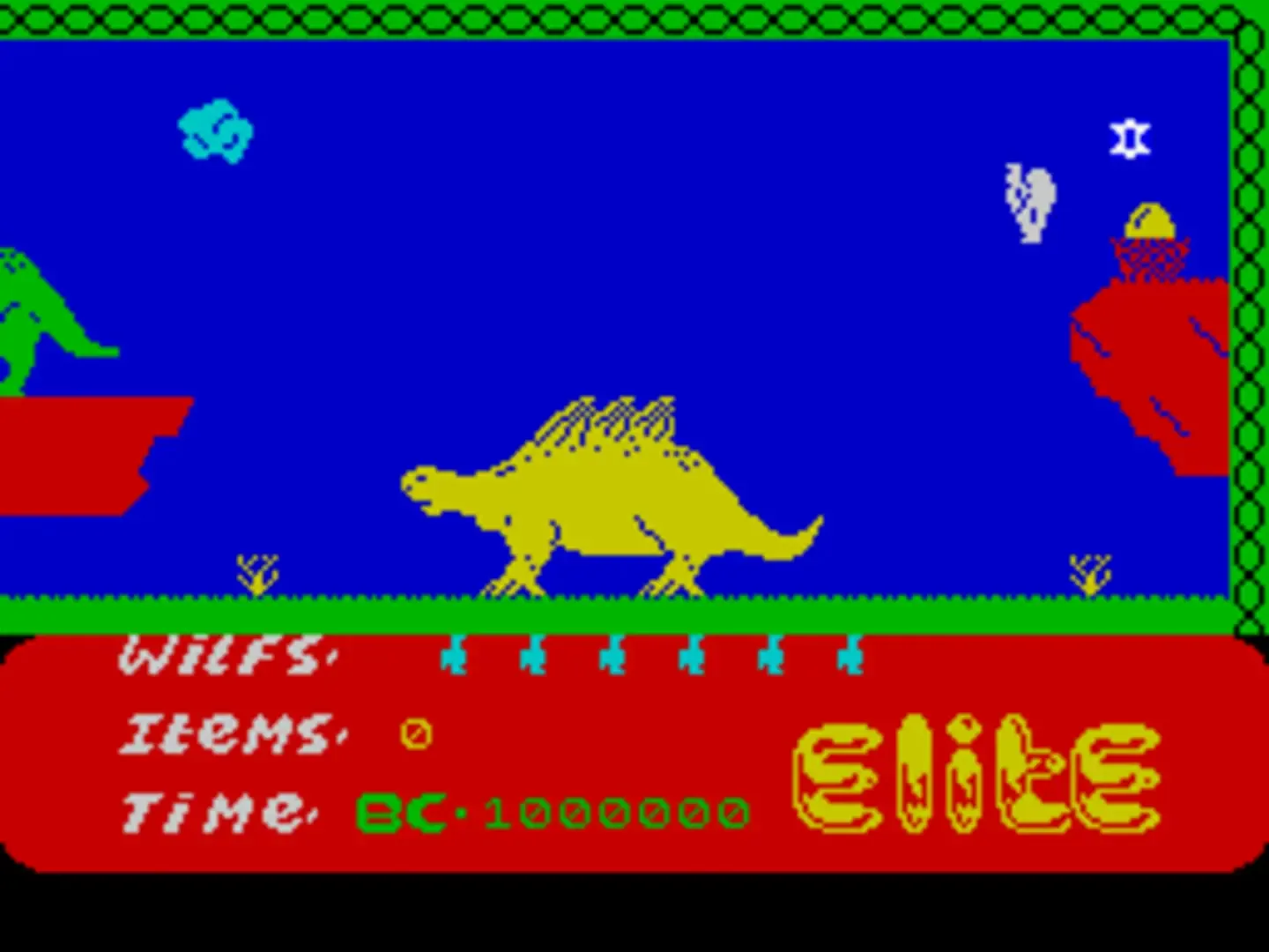 In Kokotoni Wilf, Ulrich the Magician must renew the sleep spell on the lair of dangerous dragons, lest the creatures again awake. To do this he needs the Dragon Amulet, which has been broken into many pieces and scattered across time and space. These pieces must be retrieved and reassembled. Ulrich is too old to undertake the task himself and so has sent his assistant, Kokotoni Wilf, on the mission instead. He has given Wilf magical wings to assist him on his quest.[2] The game is a 2D flip-screen platformer. The player must guide Kokotoni Wilf through a series of six levels, all set in different historical eras, in search of the pieces of the amulet (which resemble Stars of David). When all the pieces in a level have been collected a timegate will open (a flashing amulet piece) to allow Wilf to travel to the next era. Wilf's journey begins amid dinosaurs in ancient prehistory and ends amid spaceships and robots in the year 2001. Wilf cannot jump but can fly using his wings. He cannot kill enemies and must evade them instead. The game was released in conjunction with a competition by Elite Systems. The Magician's purpose in sending Wilf on his mission is only revealed on completion of the game, and the first hundred people to send this information to Elite won a copy of their next game, The Fall Guy.[1]