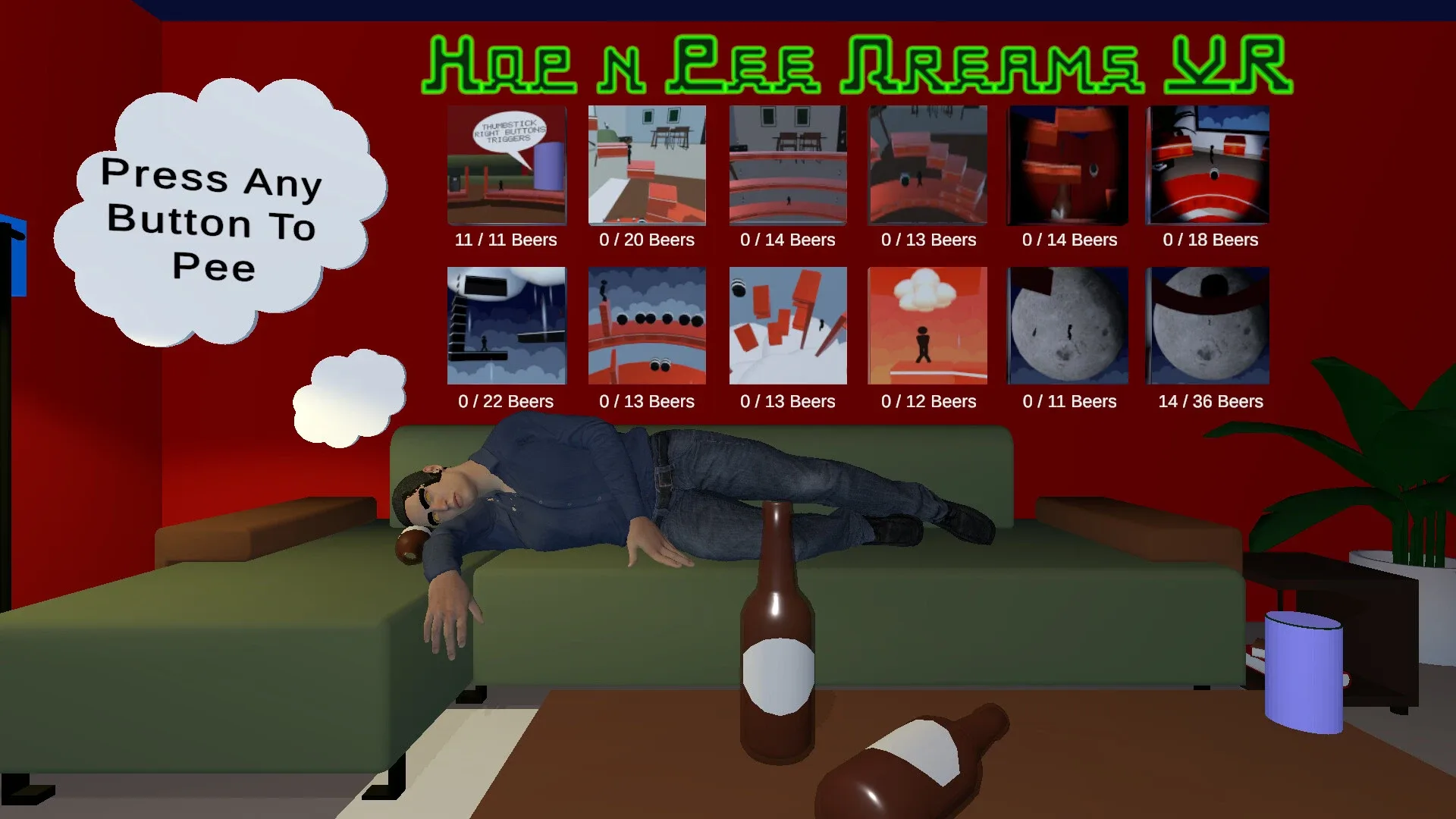Hop n Pee Dreams VR is a spirited platformer bursting with innovative VR mechanics. Embark on a short dream through cylindrical platforms as you hoard beers, dodge barrels, and search for relief amidst rock, funk and the sublime Clair de Lune! Strap in for a pee-rific adventure!