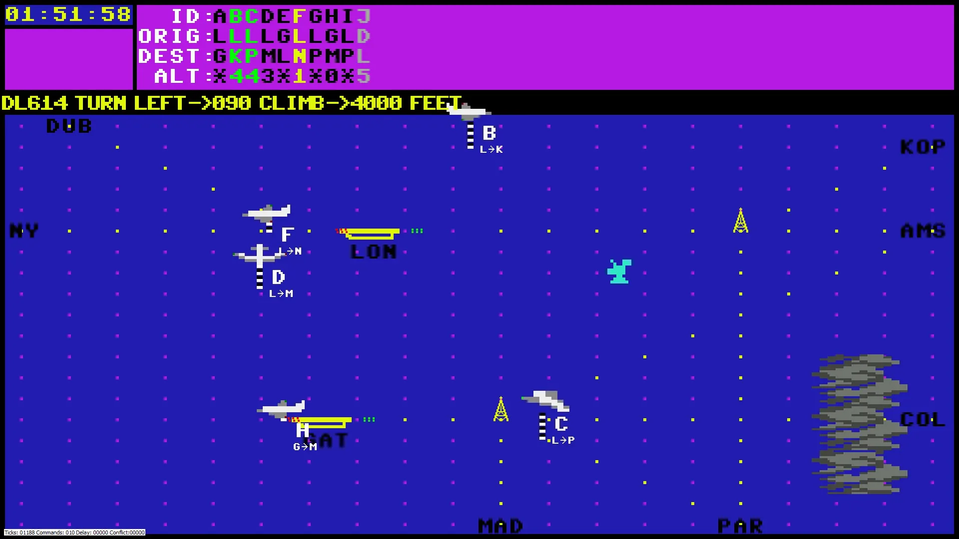 The player assumes the role of a controller in a Terminal Radar Approach Control, giving instructions to aircraft so that they can safely land, as well as take off and enter their correct flight corridors. The purpose of the game is to manage the flights that are presented to the player without the flights being delayed or exiting/landing in the wrong location. The aircraft either come flying in on the screen and have preset exit or landing points or show up as wanting to take off with an exit point. It is the player's job to determine the route each aircraft flies and when they may land or take off. The aircraft cannot be too close to each other, so the player needs to make sure that they are passing each other on different flight levels or with sufficient distance (three grid dots north/south or east/west) between them. When an aircraft is in danger of crashing or is exiting at the wrong location or altitude, the aircraft will inform the air traffic controller. Aircraft do not change course/altitude unless the player tells them to. Incoming aircraft not given clearance to land, however, will go into a holding pattern and wait until given clearance. When necessary, the player can also give holding instructions to aircraft, as long as their course takes them over a VOR tower which is used as the holding fix. To start with, there are few flights at the same time, but at higher GS levels, there are many flights that need management at the same time. Also storms which the aircraft can not pass through show up and some aircraft have very little fuel and have to land fast or they will crash.