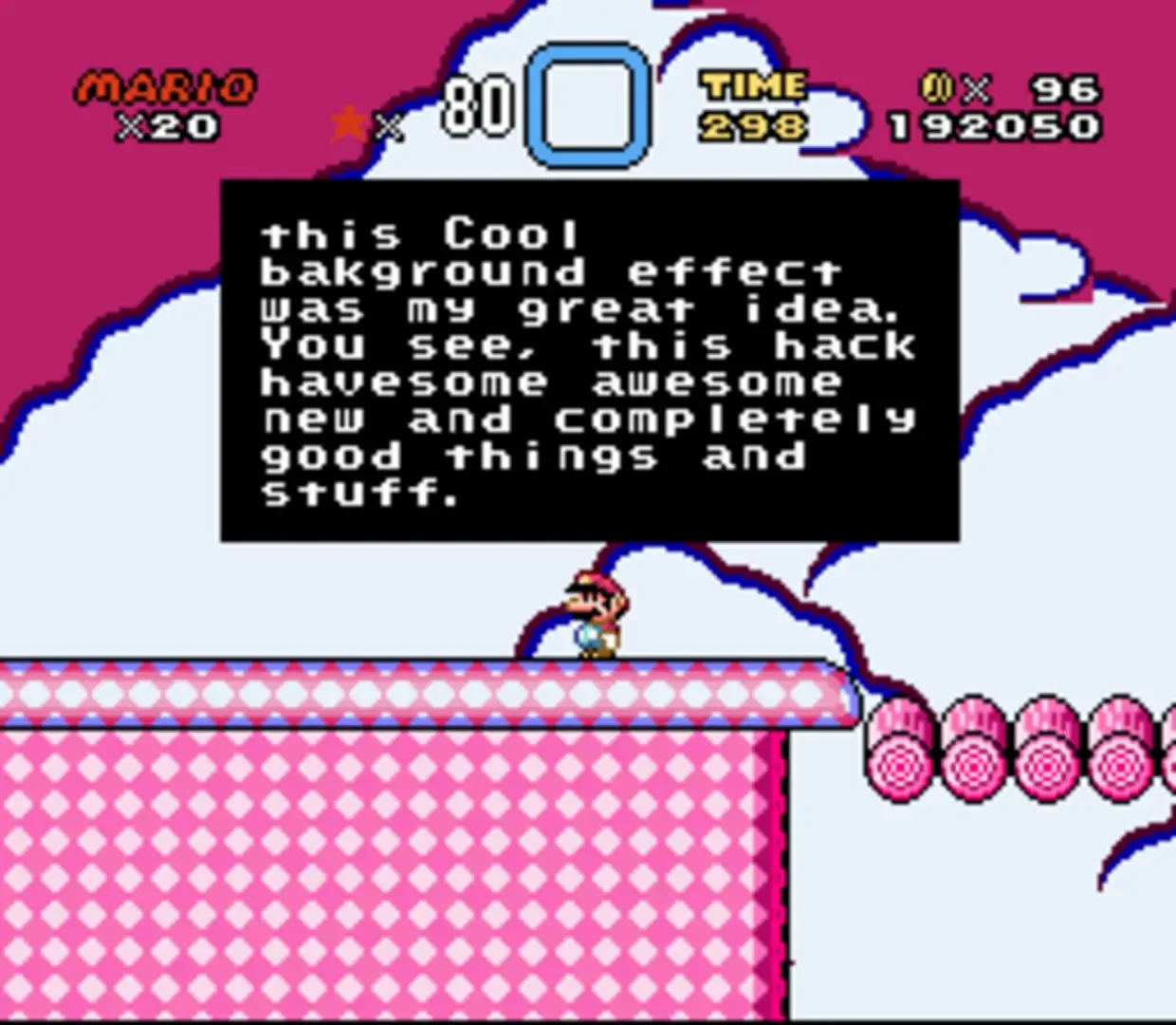 A junk hack made by FPI. This hack includes loads of glitches, horrible palettes, bad level design, message boxes filled with a bunch of junk messages, and bad grammar.