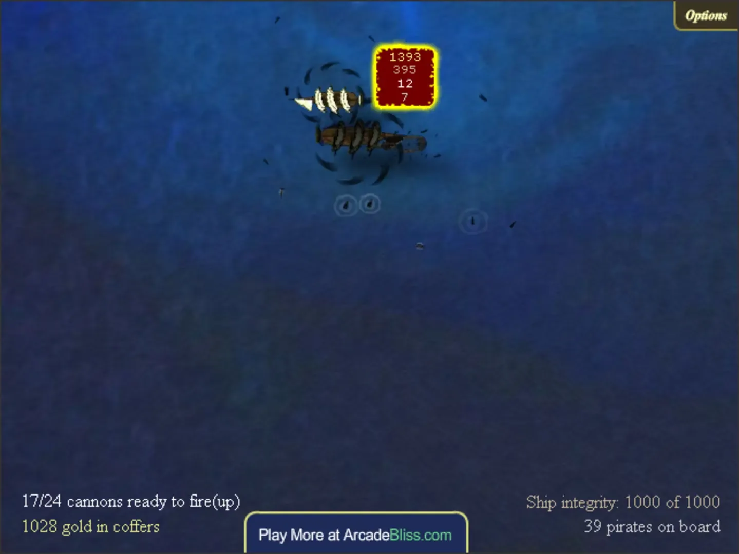 In Treasure of Cutlass Reef, the player takes control of a pirate ship as they battle through twelve stages and a seemingly unending armada, to reach Cutlass Reef and claim the buried treasure. There are three difficulty levels in all, each with their own varying degree of difficulty. Each stage contains a certain number of enemy ships (usually about a half a dozen to begin with) with the last ship being a flagship, more powerful than the rest.
