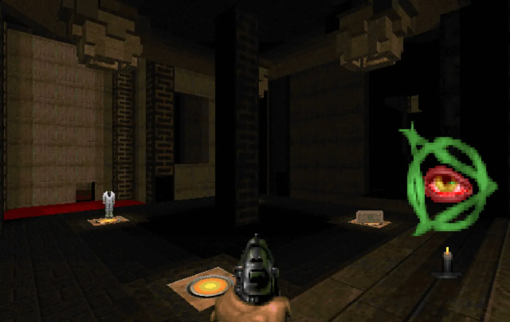 A gothic cell with positive gameplay. You can fire the rocket launcher at stuff and pick your own route through the level. Completionists can visit an optional extra fight which is a little tougher than the rest of the map. Built with Eternity 4.2 in mind; If you use Eternity you get MOD music and extra text if you leave via the secret exit. but the map itself is perfectly Boom compatible.