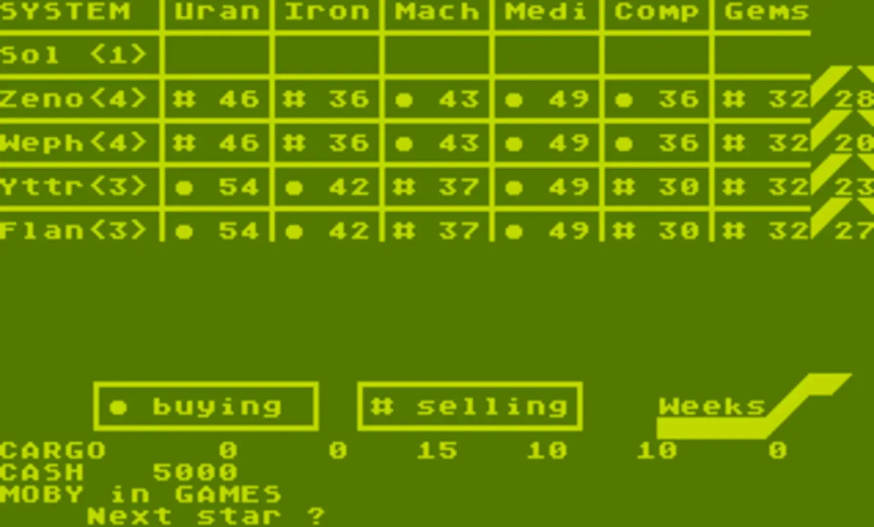 Planetfall is a sci-fi business trading game where the players command their own merchant fleet. They can travel between the different planetary systems (with changing business conditions), buy and sell any of the six available resources (uranium, iron ore, machinery, medical supplies, computers, and gems), make money and make deposits in banks. A game can have a maximum of 15 star systems.